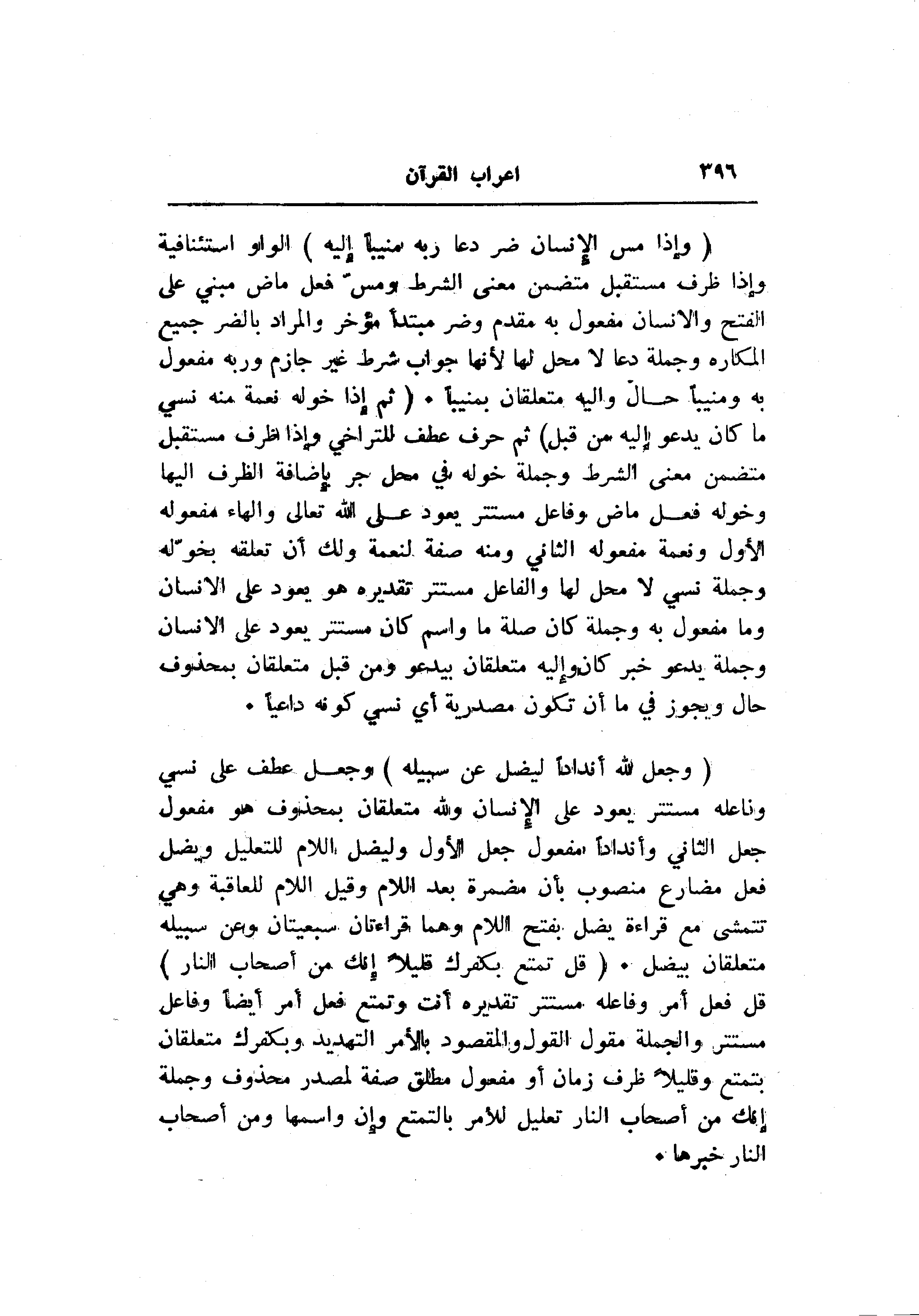 (وَجَعَلَ لِلَّهِ أَنْداداً لِيُضِلَّ عَنْ سَبِيلِهِ) وجعل عطف على نسي وفاعله مستتر يعود على الإنسان ولله متعلقان بمحذوف هو مفعول جعل الثاني وأندادا مفعول جعل الأول وليضل اللام للتعليل ويضل فعل مضارع منصوب بأن مضمرة بعد اللام وقيل اللام للعاقبة وهي تتمشى مع قراءة يضل بفتح اللام وهما قراءتان سبعيتان وعن سبيله متعلقان بيضل. (قُلْ تَمَتَّعْ بِكُفْرِكَ قَلِيلًا إِنَّكَ مِنْ أَصْحابِ النَّارِ) قل فعل أمر وفاعله مستتر تقديره أنت وتمتع فعل أمر أيضا وفاعل مستتر والجملة مقول القول والمقصود بالأمر التهديد وبكفرك متعلقان بتمتع وقليلا ظرف زمان أو مفعول مطلق صفة لمصدر محذوف وجملة إنك من أصحاب النار تعليل للأمر بالتمتع وإن واسمها ومن أصحاب النار خبرها.