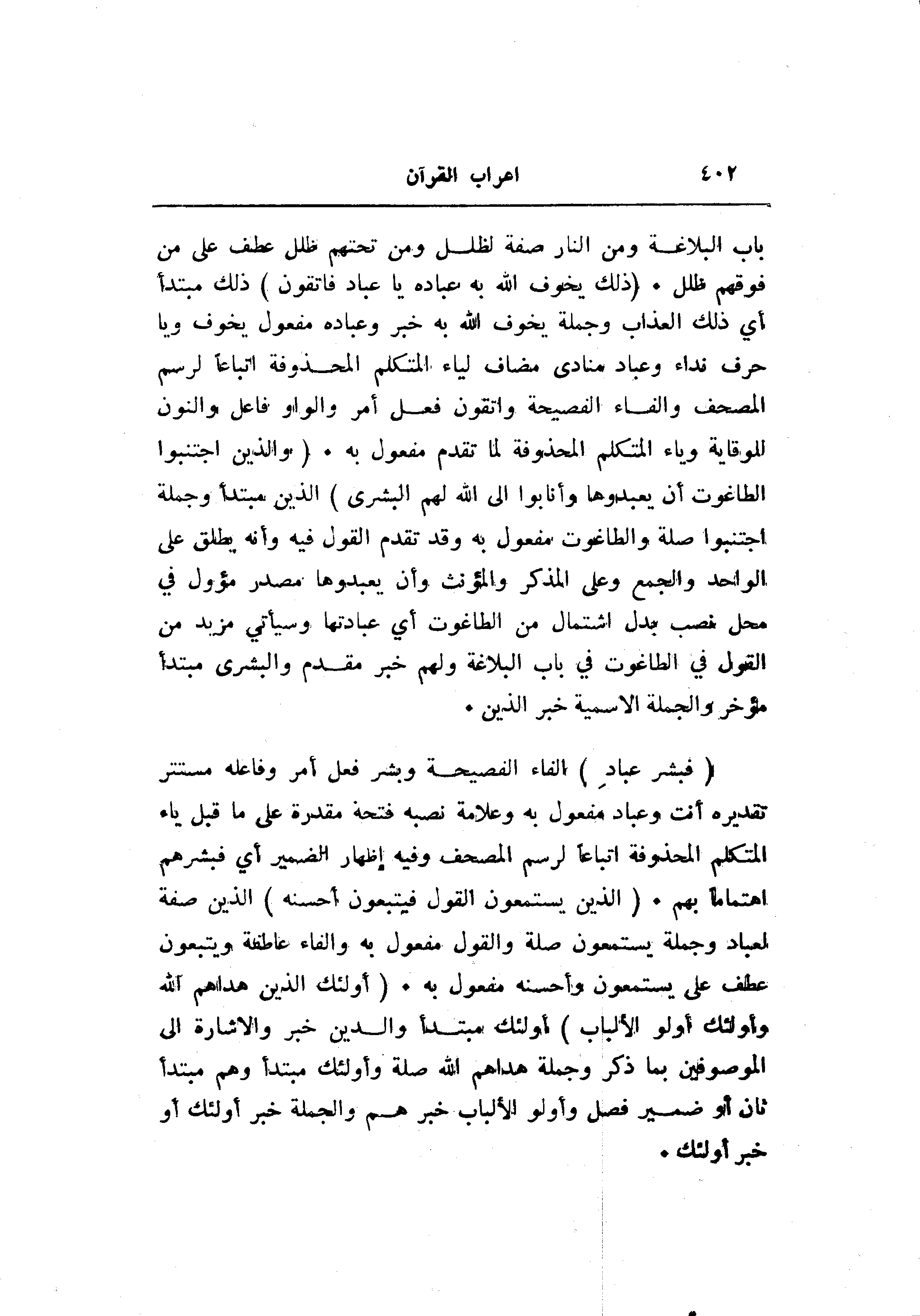 باب البلاغة ومن النار صفة لظلل ومن تحتهم ظلل عطف على من فوقهم ظلل. (ذلِكَ يُخَوِّفُ اللَّهُ بِهِ عِبادَهُ يا عِبادِ فَاتَّقُونِ) ذلك مبتدأ أي ذلك العذاب وجملة يخوف الله به خبر وعباده مفعول يخوف ويا حرف نداء وعباد منادى مضاف لياء المتكلم المحذوفة اتباعا لرسم المصحف والفاء الفصيحة واتقون فعل أمر والواو فاعل والنون للوقاية وياء المتكلم المحذوفة لما تقدم مفعول به. (وَالَّذِينَ اجْتَنَبُوا الطَّاغُوتَ أَنْ يَعْبُدُوها وَأَنابُوا إِلَى اللَّهِ لَهُمُ الْبُشْرى) الذين مبتدأ وجملة اجتنبوا صلة والطاغوت مفعول به وقد تقدم القول فيه وأنه يطلق على الواحد والجمع وعلى المذكر والمؤنث وأن يعبدوها مصدر مؤول في محل نصب بدل اشتمال من الطاغوت أي عبادتها وسيأتي مزيد من القول في الطاغوت في باب البلاغة ولهم خبر مقدم والبشرى مبتدأ مؤخر والجملة الاسمية خبر الذين.