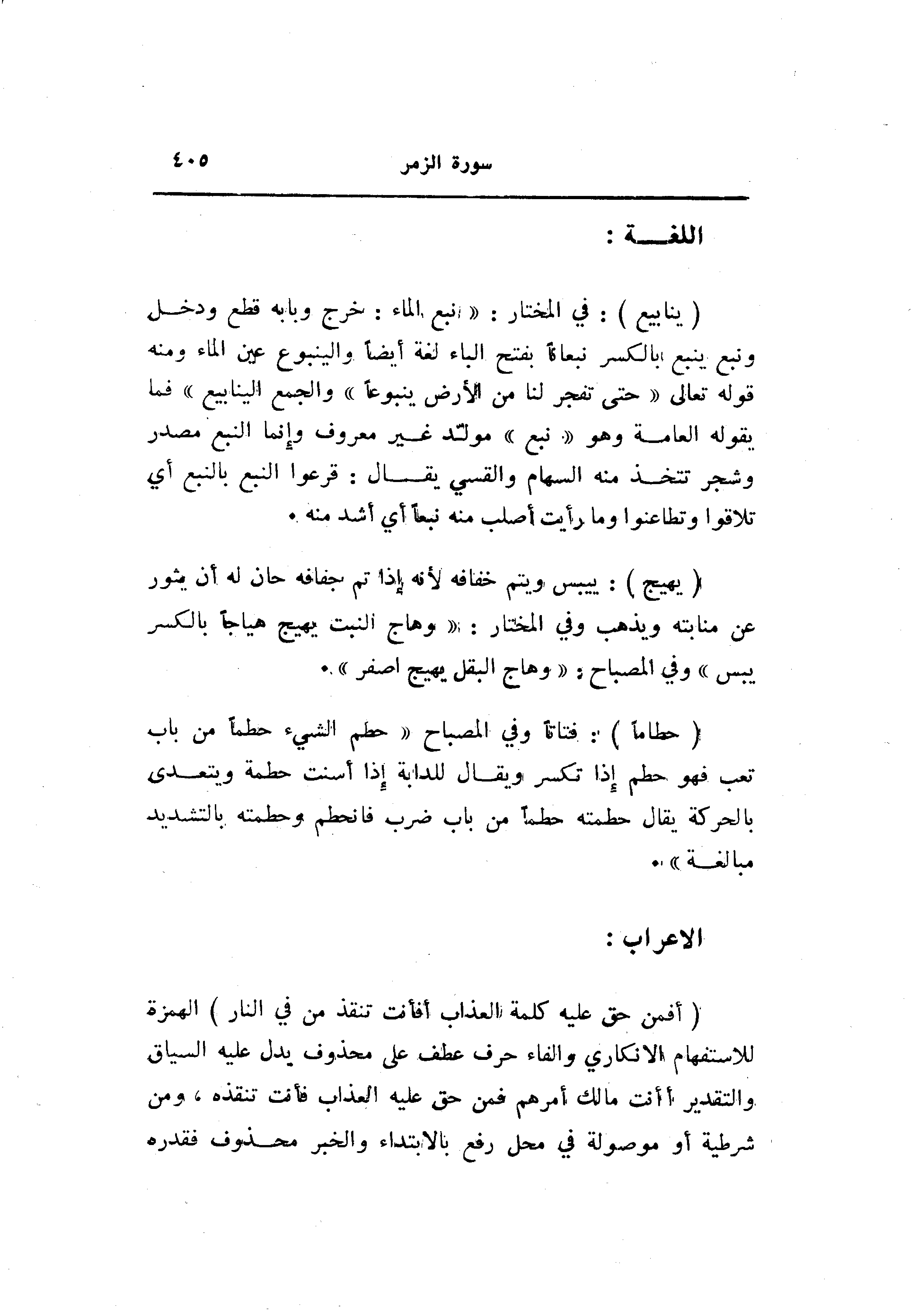(يَنابِيعَ) : في المختار: «نبع الماء: خرج وبابه قطع ودخل ونبع ينبع بالكسر نبعانا بفتح الباء لغة أيضا والينبوع عين الماء ومنه قوله تعالى «حتى تفجر لنا من الأرض ينبوعا» والجمع الينابيع» فما يقوله العامة وهو «نبع» مولّد غير معروف وإنما النبع مصدر وشجر تتخذ منه السهام والقسي يقال: قرعوا النبع بالنبع أي تلاقوا وتطاعنوا وما رأيت أصلب منه نبعا أي أشد منه.