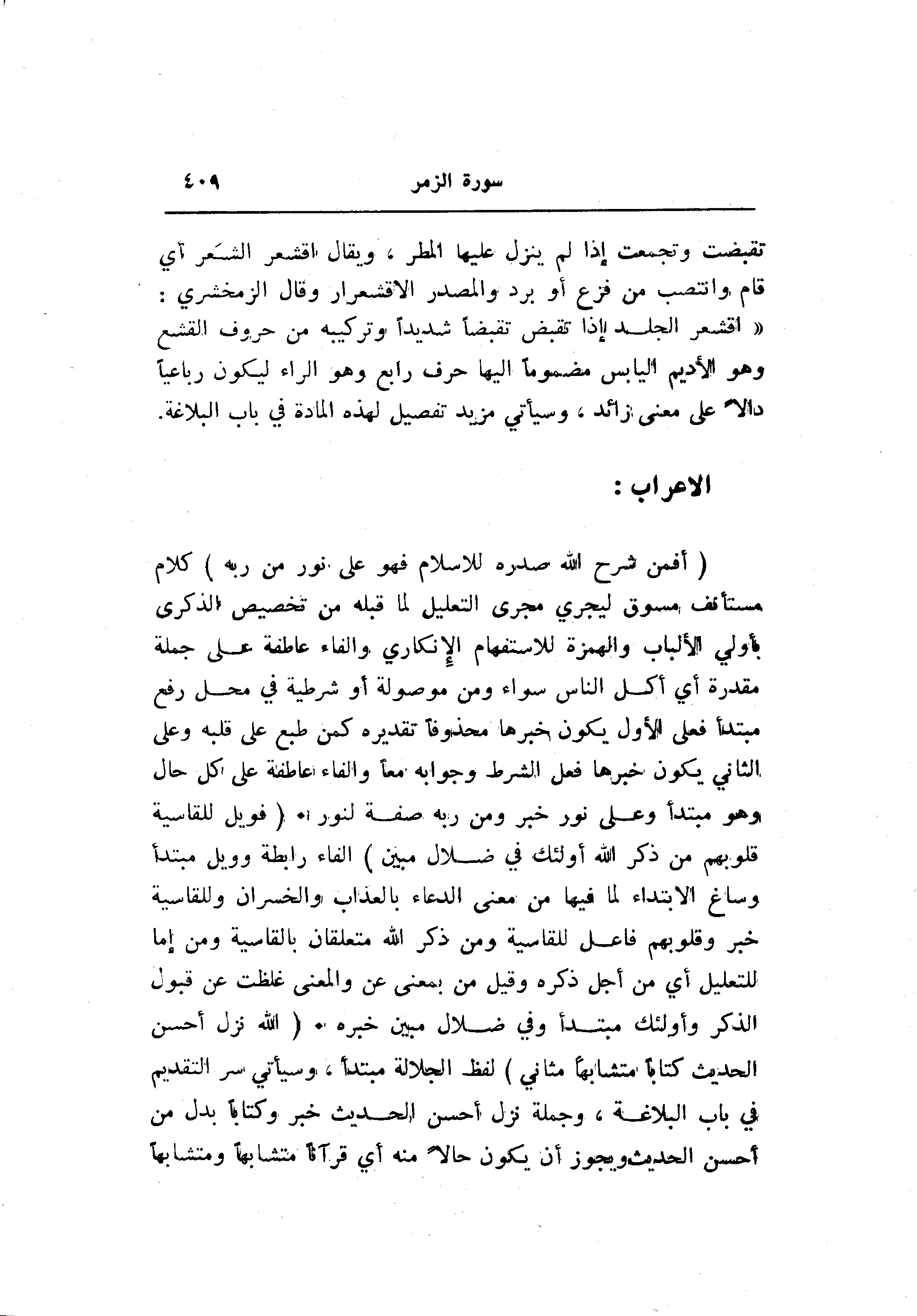 (أَفَمَنْ شَرَحَ اللَّهُ صَدْرَهُ لِلْإِسْلامِ فَهُوَ عَلى نُورٍ مِنْ رَبِّهِ) كلام مستأنف مسوق ليجري مجرى التعليل لما قبله من تخصيص الذكرى بأولي الألباب والهمزة للاستفهام الإنكاري والفاء عاطفة على جملة مقدرة أي أكل الناس سواء ومن موصولة أو شرطية في محل رفع مبتدأ فعلى الأول يكون خبرها محذوفا تقديره كمن طبع على قبله وعلى الثاني يكون خبرها فعل الشرط وجوابه معا والفاء عاطفة على كل حال وهو مبتدأ وعلى نور خبر ومن ربه صفة لنور. (فَوَيْلٌ لِلْقاسِيَةِ قُلُوبُهُمْ مِنْ ذِكْرِ اللَّهِ أُولئِكَ فِي ضَلالٍ مُبِينٍ) الفاء رابطة وويل مبتدأ وساغ الابتداء لما فيها من معنى الدعاء بالعذاب والخسران وللقاسية خبر وقلوبهم فاعل للقاسية ومن ذكر الله متعلقان بالقاسية ومن إما للتعليل أي من أجل ذكره وقيل من بمعنى عن والمعنى غلظت عن قبول الذكر وأولئك مبتدأ وفي ضلال مبين خبره. (اللَّهُ نَزَّلَ أَحْسَنَ الْحَدِيثِ كِتاباً مُتَشابِهاً مَثانِيَ) لفظ الجلالة مبتدأ، وسيأتي سر التقديم في باب البلاغة، وجملة نزل أحسن الحديث خبر وكتابا بدل من أحسن الحديث ويجوز أن يكون حالا منه أي قرآنا متشابها ومتشابها