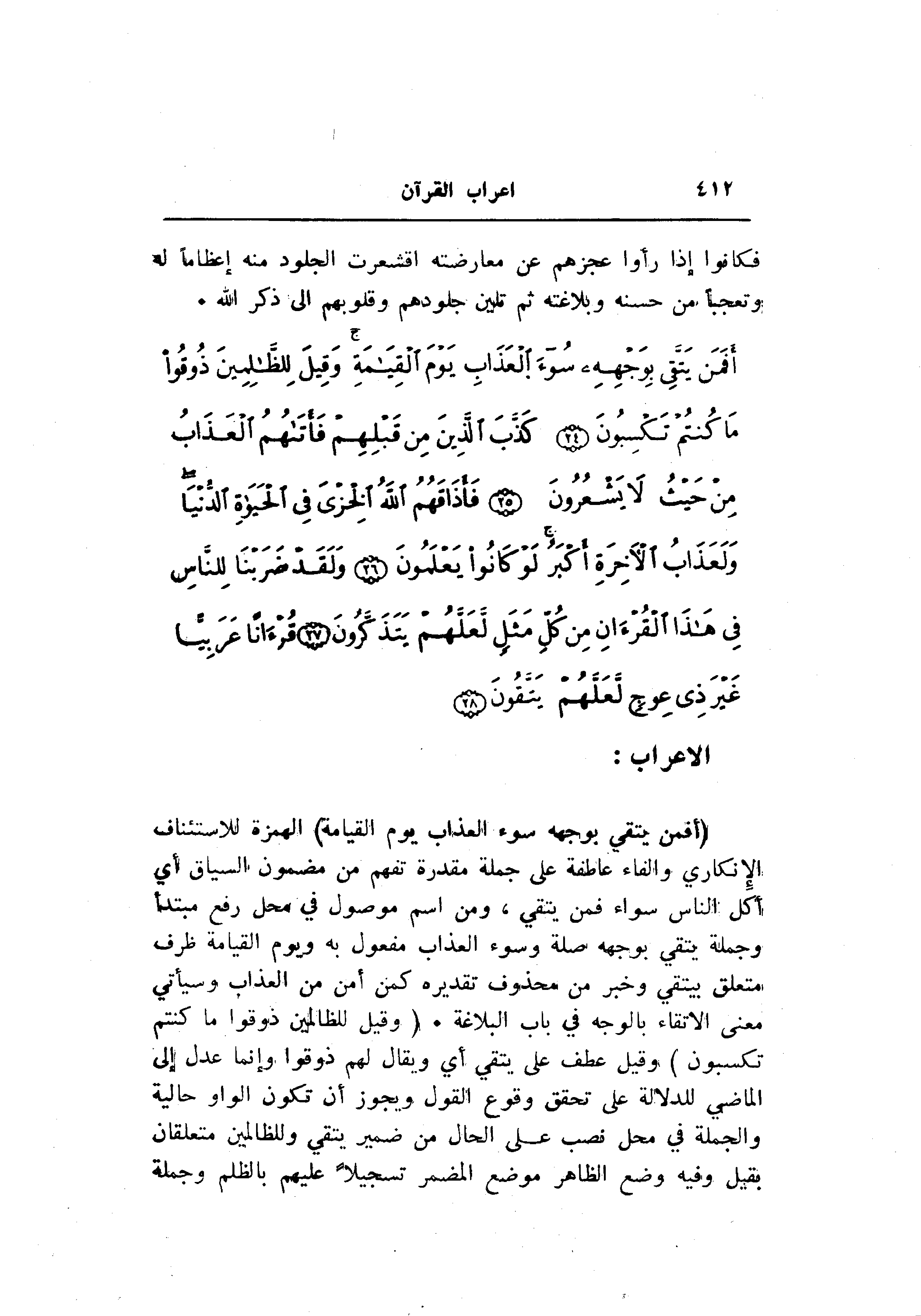 (أَفَمَنْ يَتَّقِي بِوَجْهِهِ سُوءَ الْعَذابِ يَوْمَ الْقِيامَةِ) الهمزة للاستئناف الإنكاري والفاء عاطفة على جملة مقدرة تفهم من مضمون السياق أي أكل الناس سواء فمن يتقي، ومن اسم موصول في محل رفع مبتدأ وجملة يتقي بوجهه صلة وسوء العذاب مفعول به ويوم القيامة ظرف متعلق بيتقي وخبر من محذوف تقديره كمن أمن من العذاب وسيأتي معنى الاتقاء بالوجه في باب البلاغة. (وَقِيلَ لِلظَّالِمِينَ ذُوقُوا ما كُنْتُمْ تَكْسِبُونَ) وقيل عطف على يتقي أي ويقال لهم ذوقوا وإنما عدل إلى الماضي للدلالة على تحقق وقوع القول ويجوز أن تكون الواو حالية والجملة في محل نصب على الحال من ضمير يتقي وللظالمين متعلقان بقيل وفيه وضع الظاهر موضع المضمر تسجيلا عليهم بالظلم وجملة