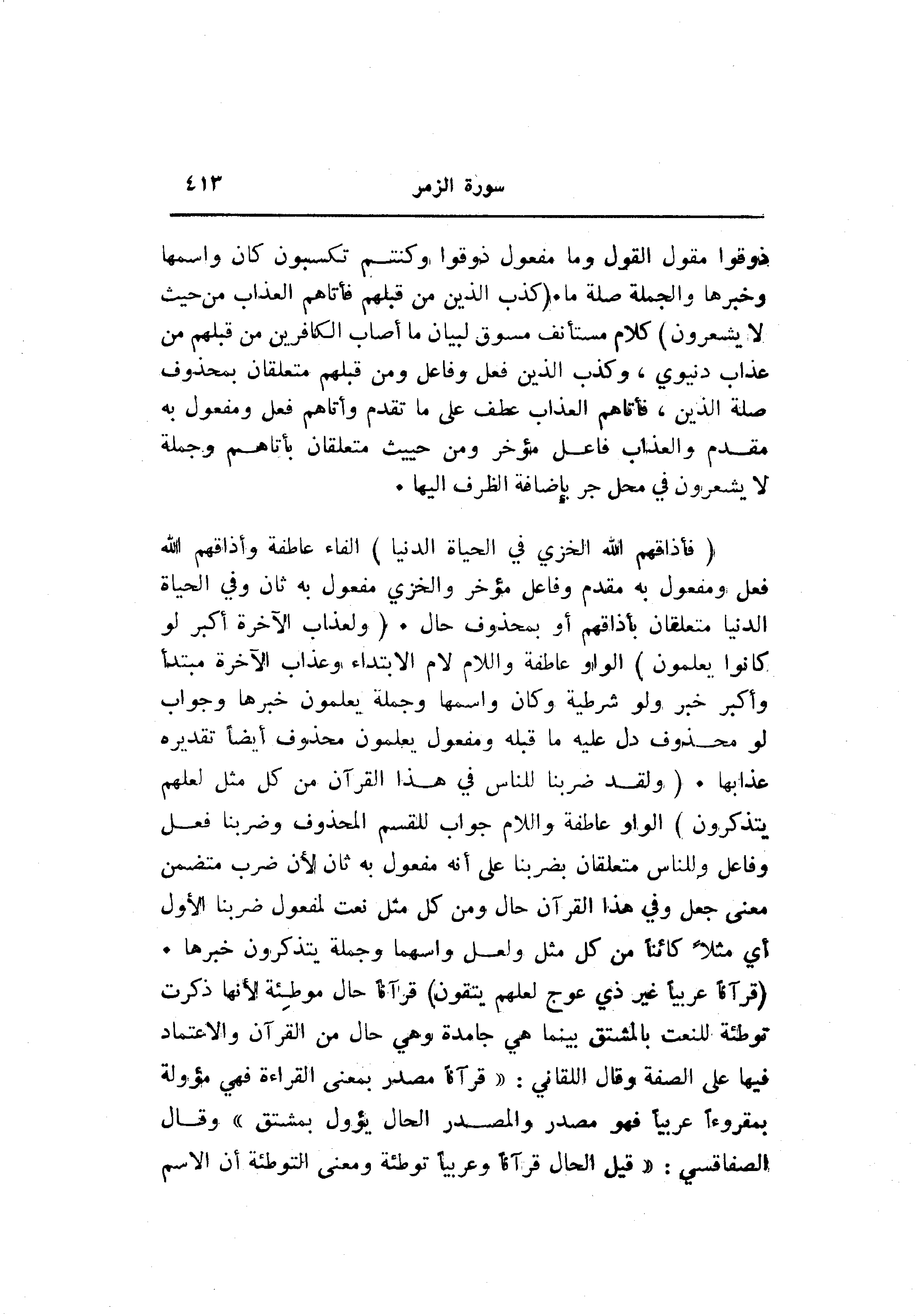 (فَأَذاقَهُمُ اللَّهُ الْخِزْيَ فِي الْحَياةِ الدُّنْيا) الفاء عاطفة وأذاقهم الله فعل ومفعول به مقدم وفاعل مؤخر والخزي مفعول به ثان وفي الحياة الدنيا متعلقان بأذاقهم أو بمحذوف حال. (وَلَعَذابُ الْآخِرَةِ أَكْبَرُ لَوْ كانُوا يَعْلَمُونَ) الواو عاطفة واللام لام الابتداء وعذاب الآخرة مبتدأ وأكبر خبر ولو شرطية وكان واسمها وجملة يعلمون خبرها وجواب لو محذوف دل عليه ما قبله ومفعول يعلمون محذوف أيضا تقديره عذابها. (وَلَقَدْ ضَرَبْنا لِلنَّاسِ فِي هذَا الْقُرْآنِ مِنْ كُلِّ مَثَلٍ لَعَلَّهُمْ يَتَذَكَّرُونَ) الواو عاطفة واللام جواب للقسم المحذوف وضربنا فعل وفاعل وللناس متعلقان بضربنا على أنه مفعول به ثان لأن ضرب متضمن معنى جعل وفي هذا القرآن حال ومن كل مثل نعت لمفعول ضربنا الأول أي مثلا كائنا من كل مثل ولعل واسمها وجملة يتذكرون خبرها.