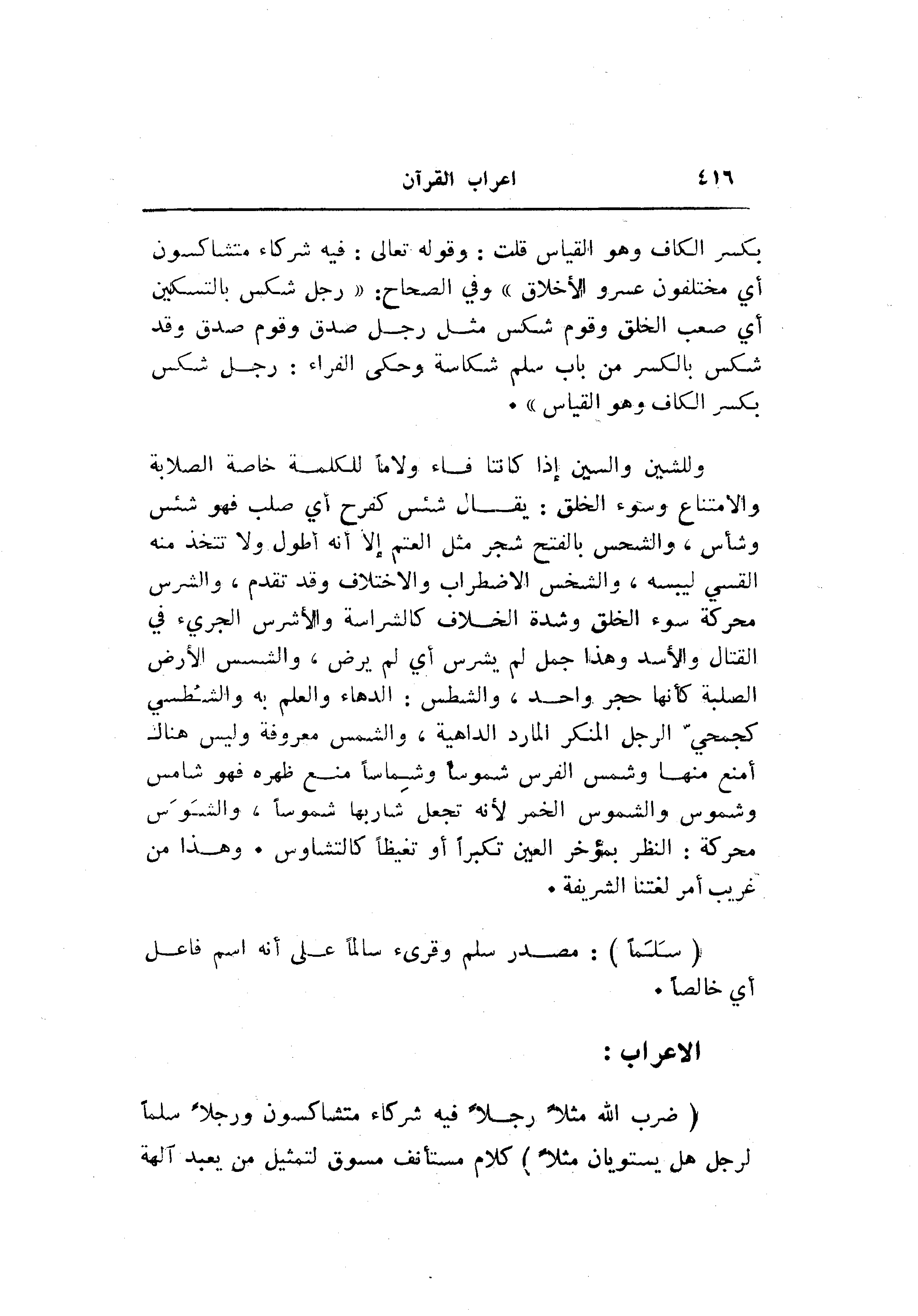 بكسر الكاف وهو القياس قلت: وقوله تعالى: فيه شركاء متشاكسون أي مختلفون عسرو الأخلاق» وفي الصحاح: «رجل شكس بالتسكين أي صعب الخلق وقوم شكس مثل رجل صدق وقوم صدق وقد شكس بالكسر من باب سلم شكاسة وحكى الفراء: رجل شكس بكسر الكاف وهو القياس» .