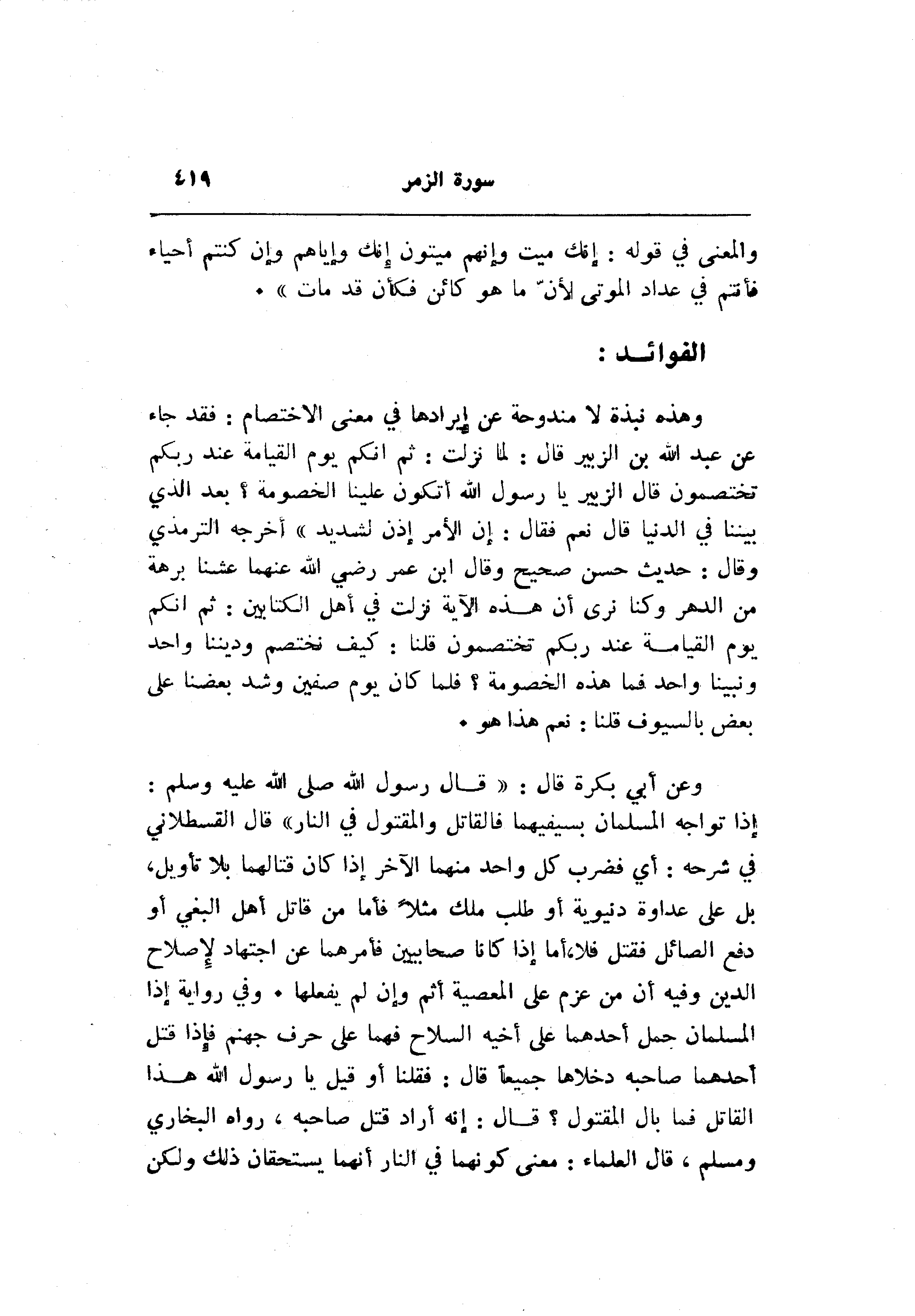 إذا تواجه المسلمان بسيفيهما فالقاتل والمقتول في النار» قال القسطلاني في شرحه: أي فضرب كل واحد منهما الآخر إذا كان قتالهما بلا تأويل، بل على عداوة دنيوية أو طلب ملك مثلا فأما من قاتل أهل البغي أو دفع الصائل فقتل فلا، أما إذا كانا صحابيين فأمرهما عن اجتهاد لإصلاح الدين وفيه أن من عزم على المعصية أثم وإن لم يفعلها. وفي رواية إذا المسلمان جمل أحدهما على أخيه السلاح فهما على حرف جهنم فإذا قتل أحدهما صاحبه دخلاها جميعا قال: فقلنا أو قيل يا رسول الله هذا القاتل فما بال المقتول؟ قال: إنه أراد قتل صاحبه، رواه البخاري ومسلم، قال العلماء: معنى كونهما في النار أنهما يستحقان ذلك ولكن