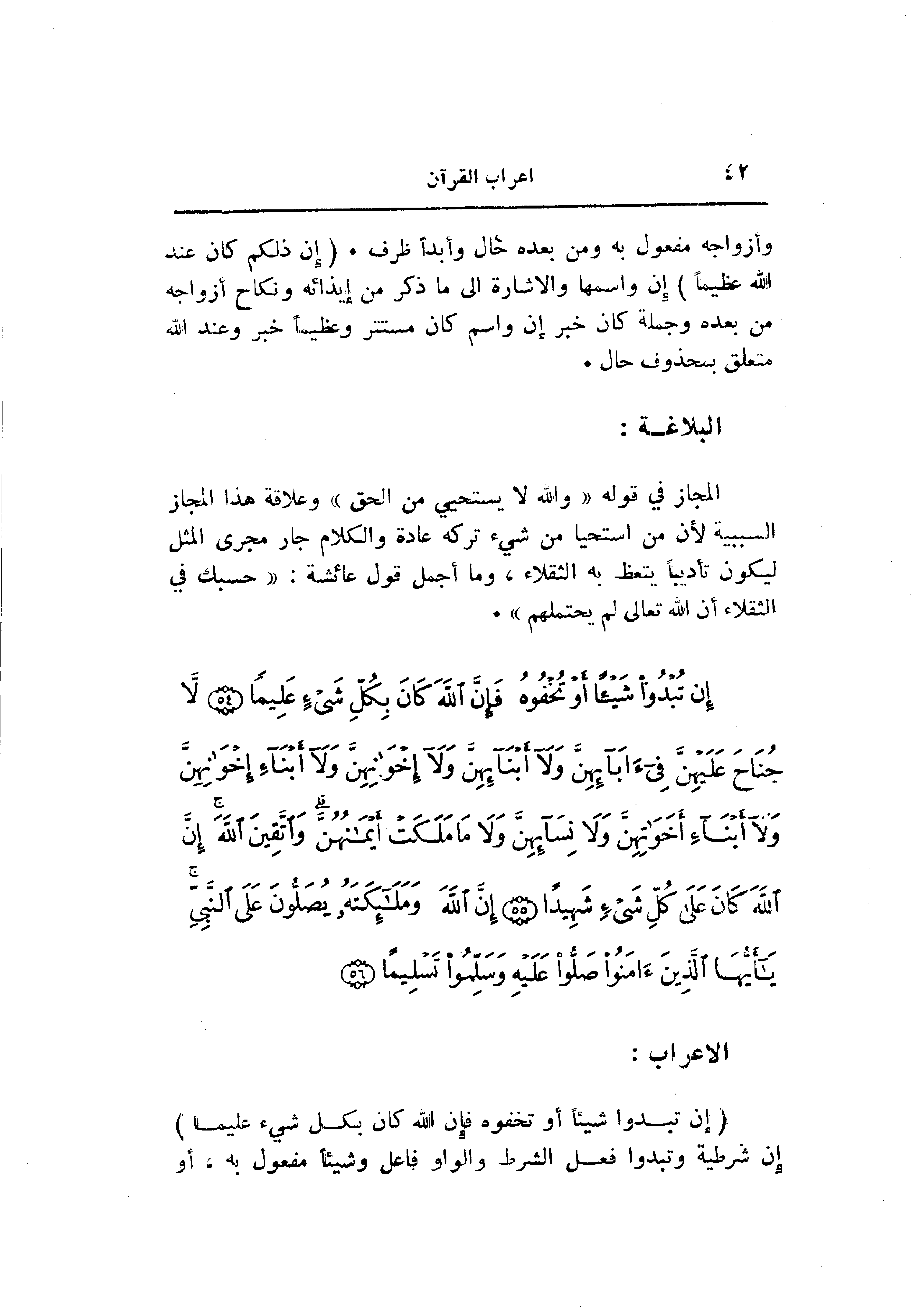 وأزواجه مفعول به ومن بعده حال وأبدا ظرف. (إِنَّ ذلِكُمْ كانَ عِنْدَ اللَّهِ عَظِيماً) إن واسمها والاشارة الى ما ذكر من إيذائه ونكاح أزواجه من بعده وجملة كان خبر إن واسم كان مستتر وعظيما خبر وعند الله متعلق بمحذوف حال.