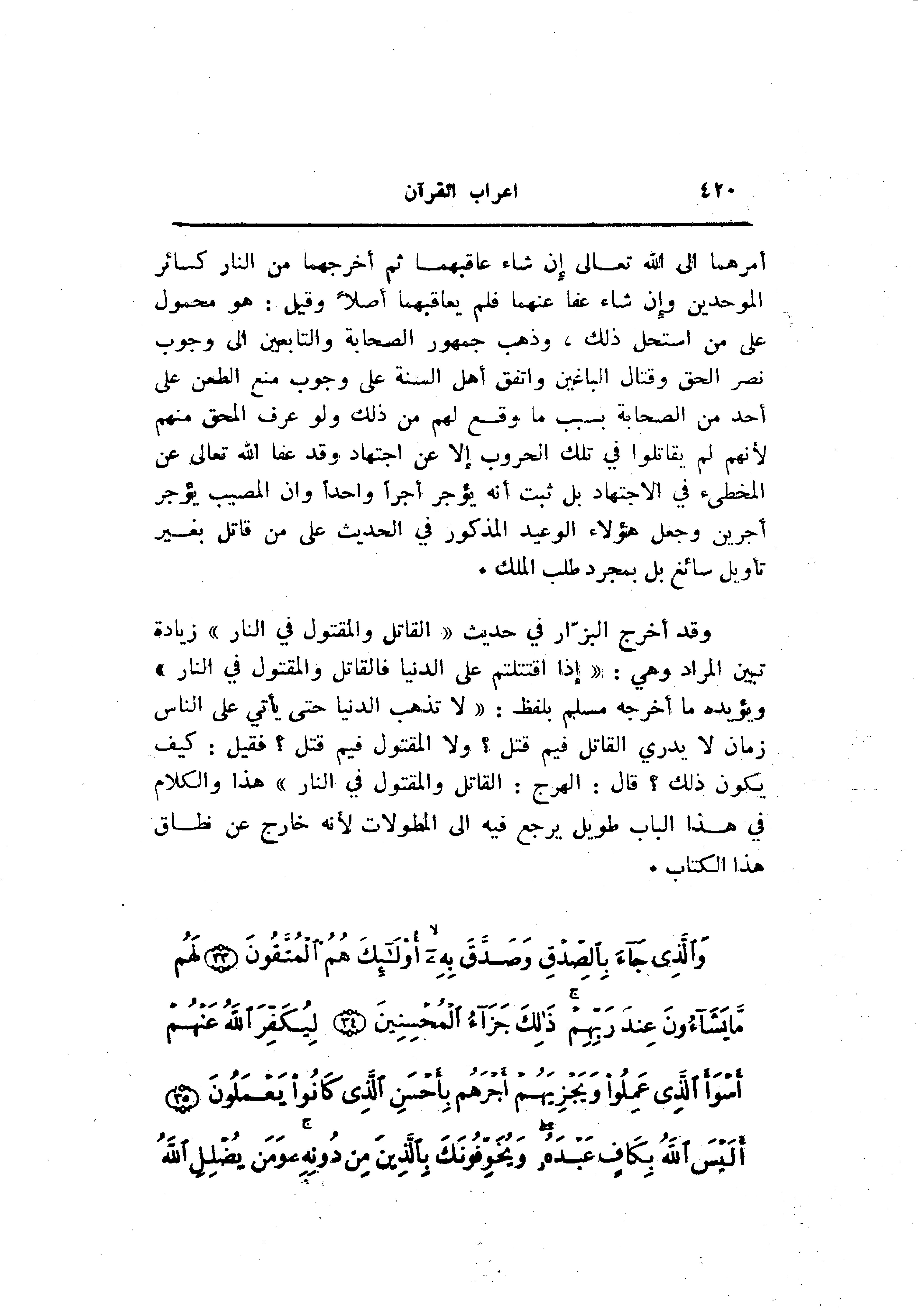 وقد أخرج البزّار في حديث «القاتل والمقتول في النار» زيادة تبين المراد وهي: «إذا اقتتلتم على الدنيا فالقاتل والمقتول في النار» ويؤيده ما أخرجه مسلم بلفظ: «لا تذهب الدنيا حتى يأتي على الناس زمان لا يدري القاتل فيم قتل؟ ولا المقتول فيم قتل؟ فقيل: كيف يكون ذلك؟ قال: الهرج: القاتل والمقتول في النار» هذا والكلام في هذا الباب طويل يرجع فيه الى المطولات لأنه خارج عن نطاق هذا الكتاب.