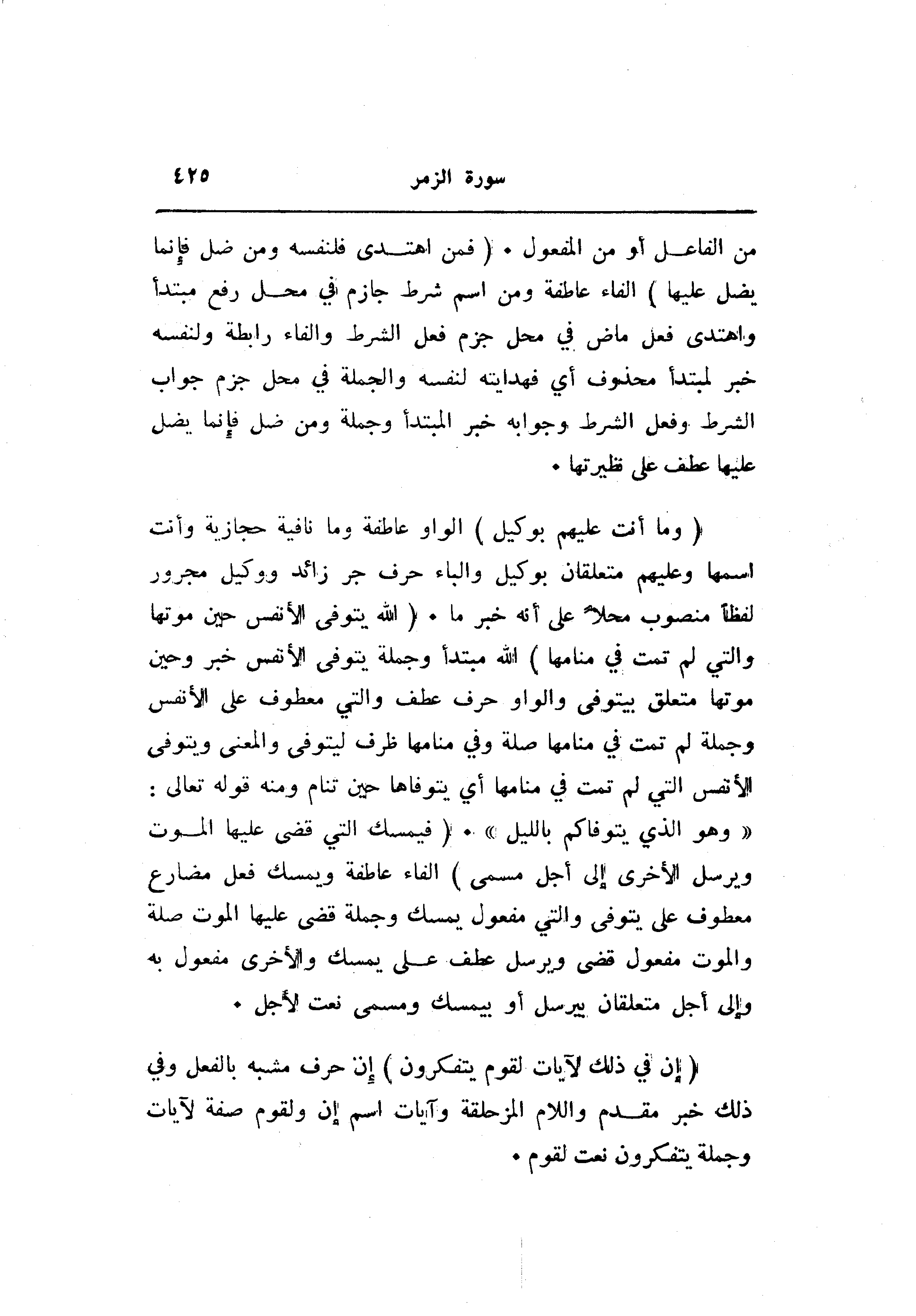 (وَما أَنْتَ عَلَيْهِمْ بِوَكِيلٍ) الواو عاطفة وما نافية حجازية وأنت اسمها وعليهم متعلقان بوكيل والباء حرف جر زائد ووكيل مجرور لفظا منصوب محلا على أنه خبر ما. (اللَّهُ يَتَوَفَّى الْأَنْفُسَ حِينَ مَوْتِها وَالَّتِي لَمْ تَمُتْ فِي مَنامِها) الله مبتدأ وجملة يتوفى الأنفس خبر وحين موتها متعلق بيتوفى والواو حرف عطف والتي معطوف على الأنفس وجملة لم تمت في منامها صلة وفي منامها ظرف ليتوفى والمعنى ويتوفى الأنفس التي لم تمت في منامها أي يتوفاها حين تنام ومنه قوله تعالى: