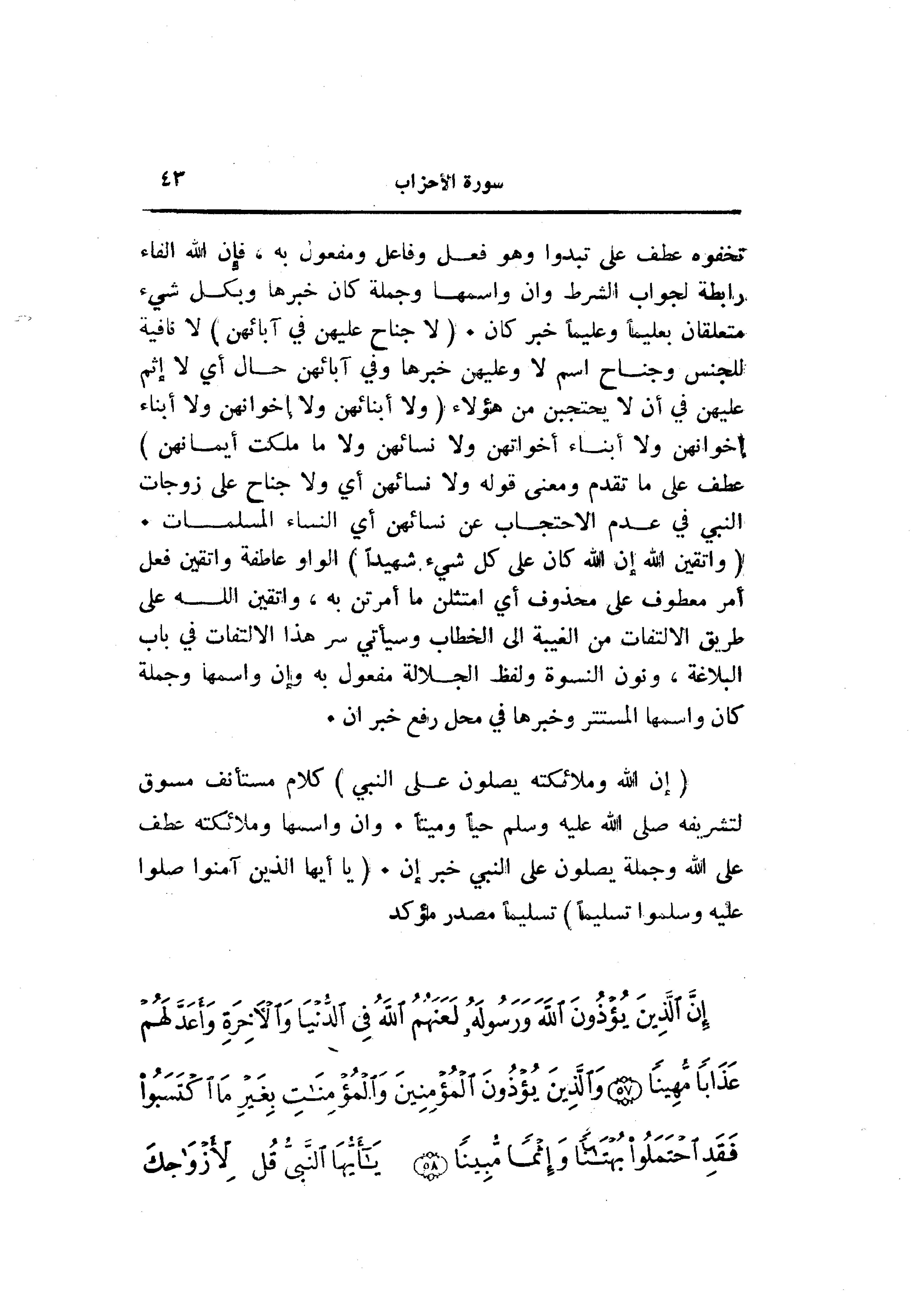 تخفوه عطف على تبدوا وهو فعل وفاعل ومفعول به، فإن الله الفاء رابطة لجواب الشرط وان واسمها وجملة كان خبرها وبكل شيء متعلقان بعليما وعليما خبر كان. (لا جُناحَ عَلَيْهِنَّ فِي آبائِهِنَّ) لا نافية للجنس وجناح اسم لا وعليهن خبرها وفي آبائهن حال أي لا إثم عليهن في أن لا يحتجبن من هؤلاء (وَلا أَبْنائِهِنَّ وَلا إِخْوانِهِنَّ وَلا أَبْناءِ إِخْوانِهِنَّ وَلا أَبْناءِ أَخَواتِهِنَّ وَلا نِسائِهِنَّ وَلا ما مَلَكَتْ أَيْمانُهُنَّ) عطف على ما تقدم ومعنى قوله ولا نسائهن أي ولا جناح على زوجات النبي في عدم الاحتجاب عن نسائهن أي النساء المسلمات.