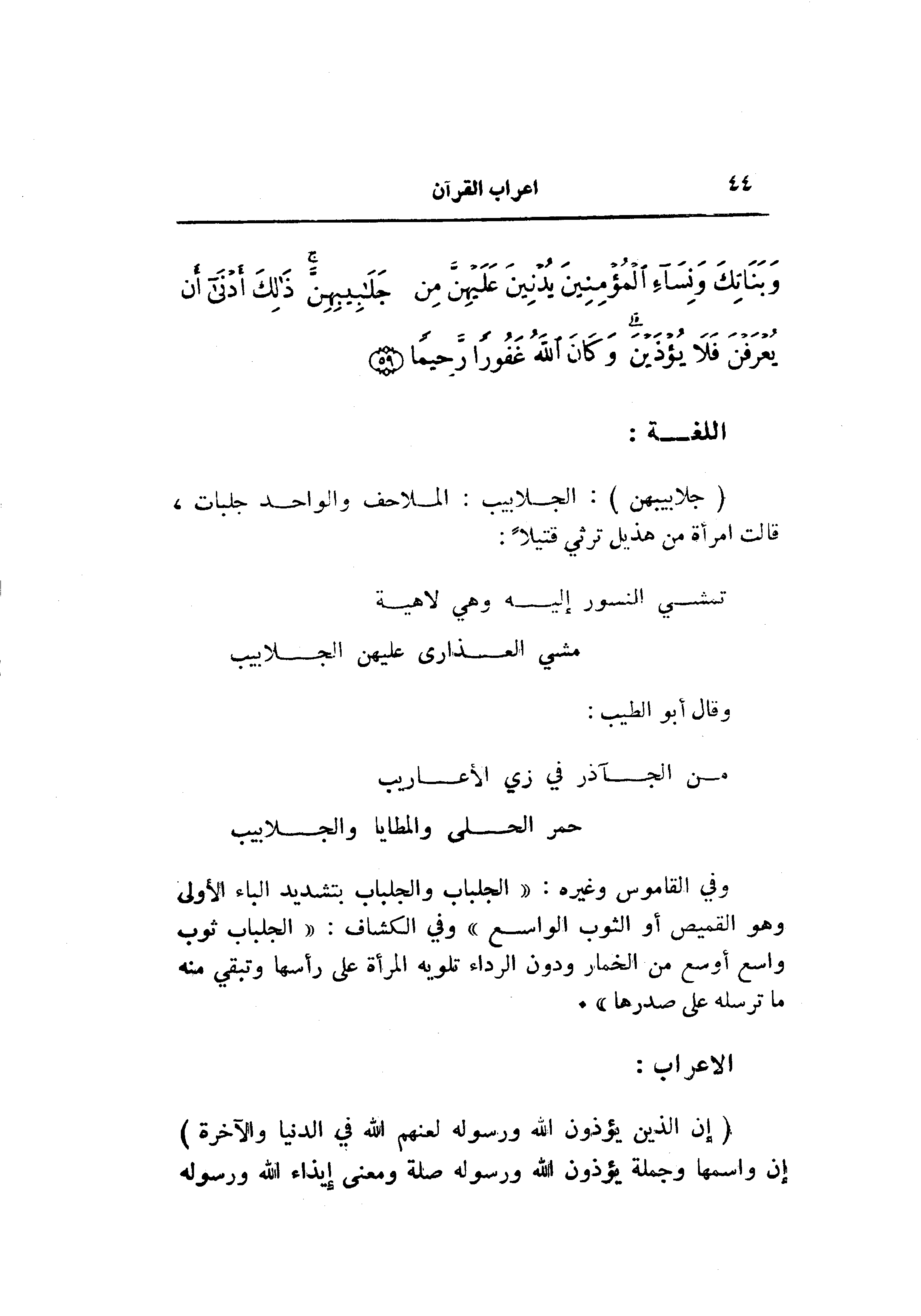 وفي القاموس وغيره: «الجلباب والجلباب بتشديد الباء الأولى وهو القميص أو الثوب الواسع» وفي الكشاف: «الجلباب ثوب واسع أوسع من الخمار ودون الرداء تلويه المرأة على رأسها وتبقي منه ما ترسله على صدرها» .