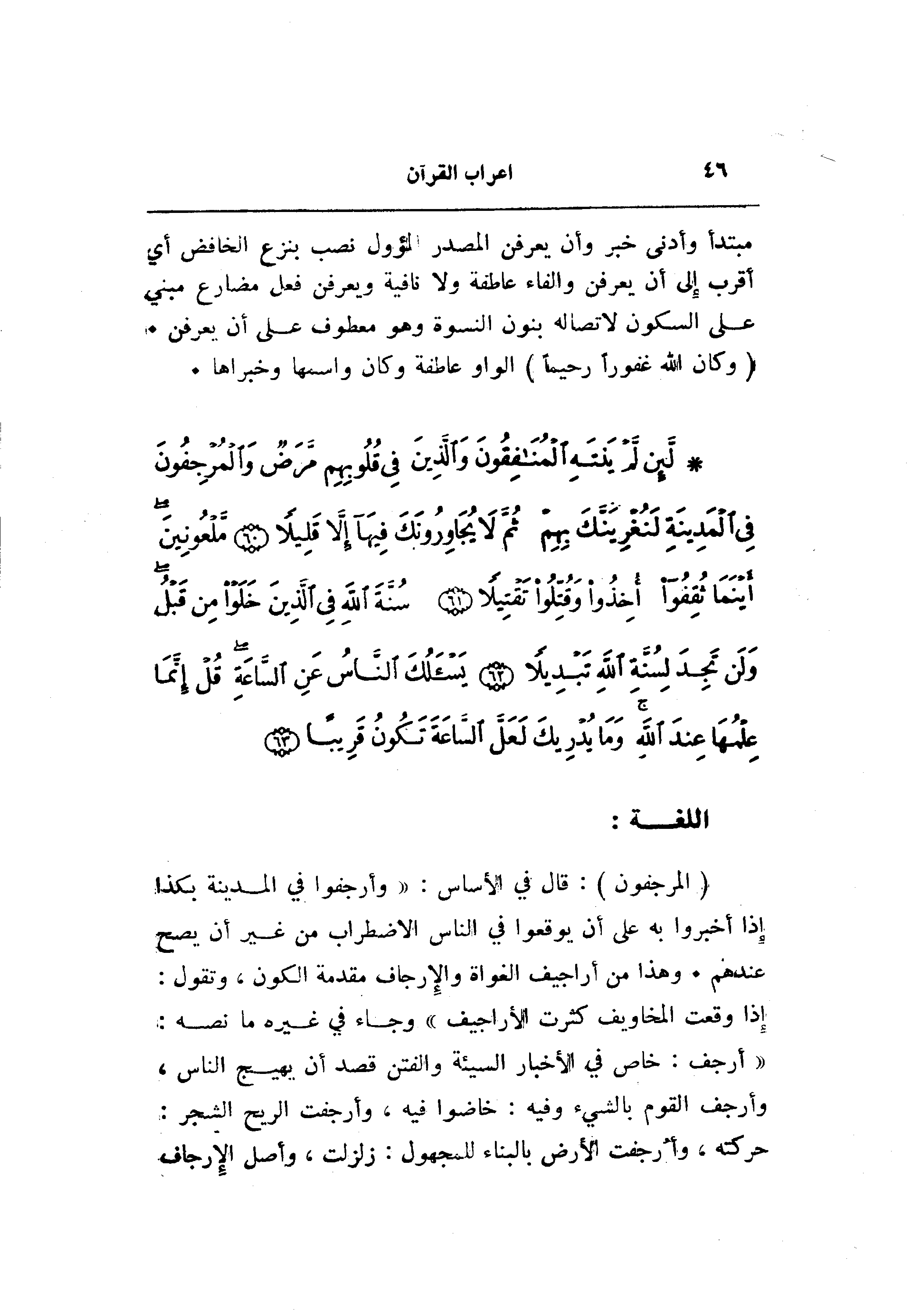 (الْمُرْجِفُونَ) : قال في الأساس: «وأرجفوا في المدينة بكذا إذا أخبروا به على أن يوقعوا في الناس الاضطراب من غير أن يصح عندهم. وهذا من أراجيف الغواة والإرجاف مقدمة الكون، وتقول: