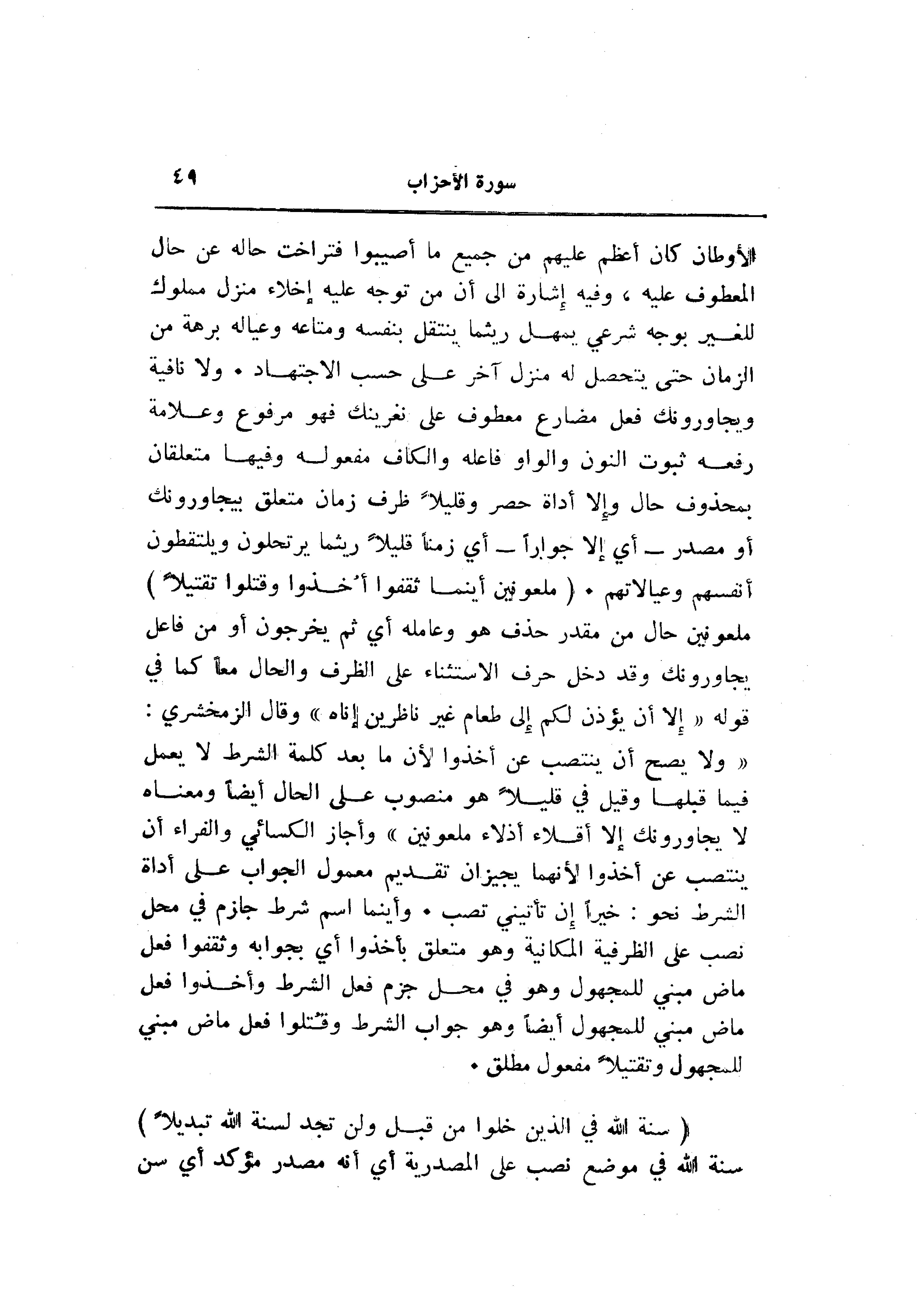 الأوطان كان أعظم عليهم من جميع ما أصيبوا فتراخت حاله عن حال المعطوف عليه، وفيه إشارة الى أن من توجه عليه إخلاء منزل مملوك للغير بوجه شرعي يمهل ريثما ينتقل بنفسه ومتاعه وعياله برهة من الزمان حتى يتحصل له منزل آخر على حسب الاجتهاد. ولا نافية ويجاورونك فعل مضارع معطوف على نغرينك فهو مرفوع وعلامة رفعه ثبوت النون والواو فاعله والكاف مفعوله وفيها متعلقان بمحذوف حال وإلا أداة حصر وقليلا ظرف زمان متعلق بيجاورونك أو مصدر- أي إلا جوارا- أي زمنا قليلا ريثما يرتحلون ويلتقطون أنفسهم وعيالاتهم. (مَلْعُونِينَ أَيْنَما ثُقِفُوا أُخِذُوا وَقُتِّلُوا تَقْتِيلًا) ملعونين حال من مقدر حذف هو وعامله أي ثم يخرجون أو من فاعل يجاورونك وقد دخل حرف الاستثناء على الظرف والحال معا كما في قوله «إلا أن يؤذن لكم إلى طعام غير ناظرين إناه» وقال الزمخشري: