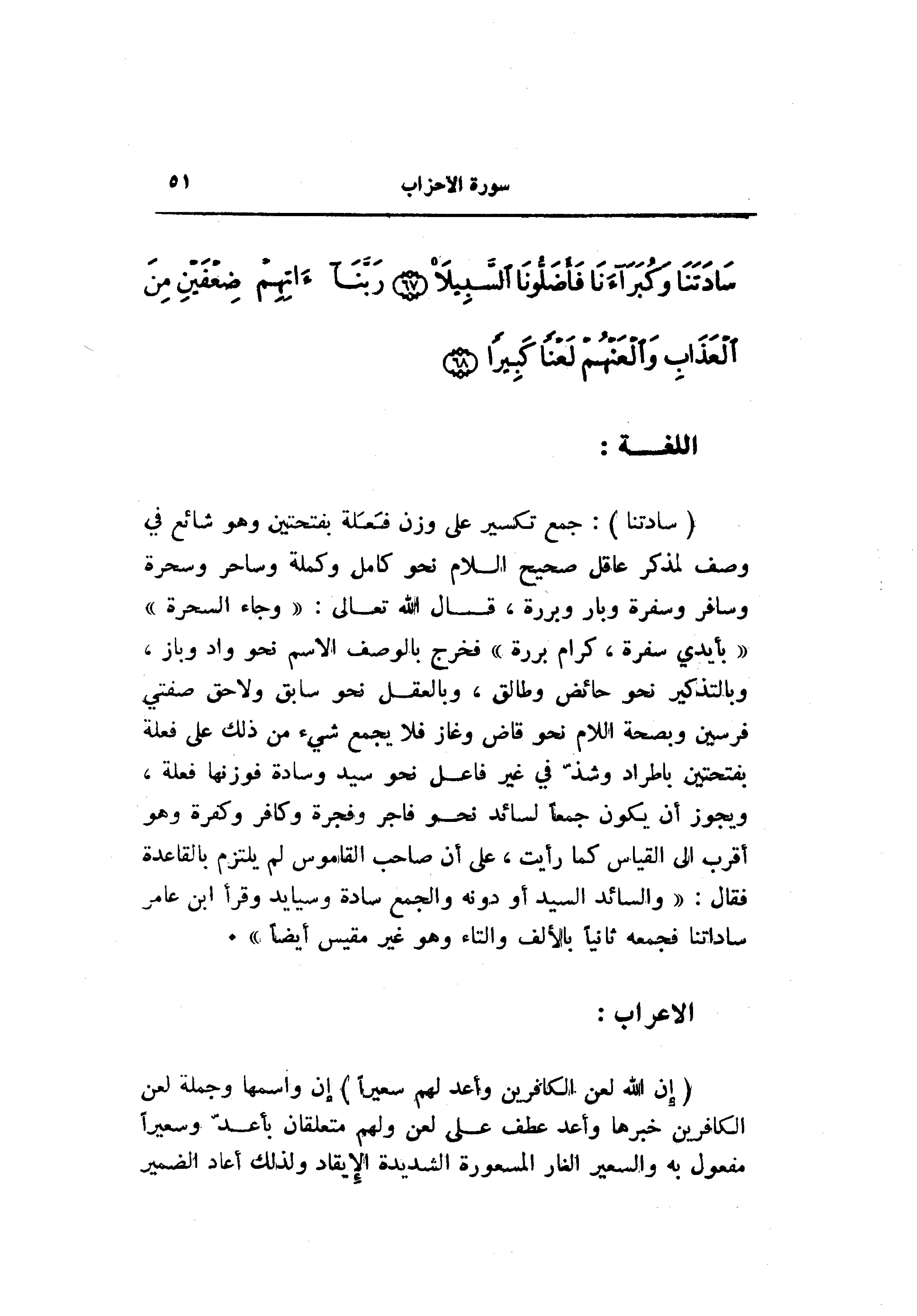 (سادَتَنا) : جمع تكسير على وزن فعلة بفتحتين وهو شائع في وصف لمذكر عاقل صحيح اللام نحو كامل وكملة وساحر وسحرة وسافر وسفرة وبار وبررة، قال الله تعالى: «وجاء السحرة» «بأيدي سفرة، كرام بررة» فخرج بالوصف الاسم نحو واد وباز، وبالتذكير نحو حائض وطالق، وبالعقل نحو سابق ولا حق صفتي فرسين وبصحة اللام نحو قاض وغاز فلا يجمع شيء من ذلك على فعلة بفتحتين باطراد وشذّ في غير فاعل نحو سيد وسادة فوزنها فعلة، ويجوز أن يكون جمعا لسائد نحو فاجر وفجرة وكافر وكفرة وهو أقرب الى القياس كما رأيت، على أن صاحب القاموس لم يلتزم بالقاعدة فقال: «والسائد السيد أو دونه والجمع سادة وسيايد وقرأ ابن عامر ساداتنا فجمعه ثانيا بالألف والتاء وهو غير مقيس أيضا» .