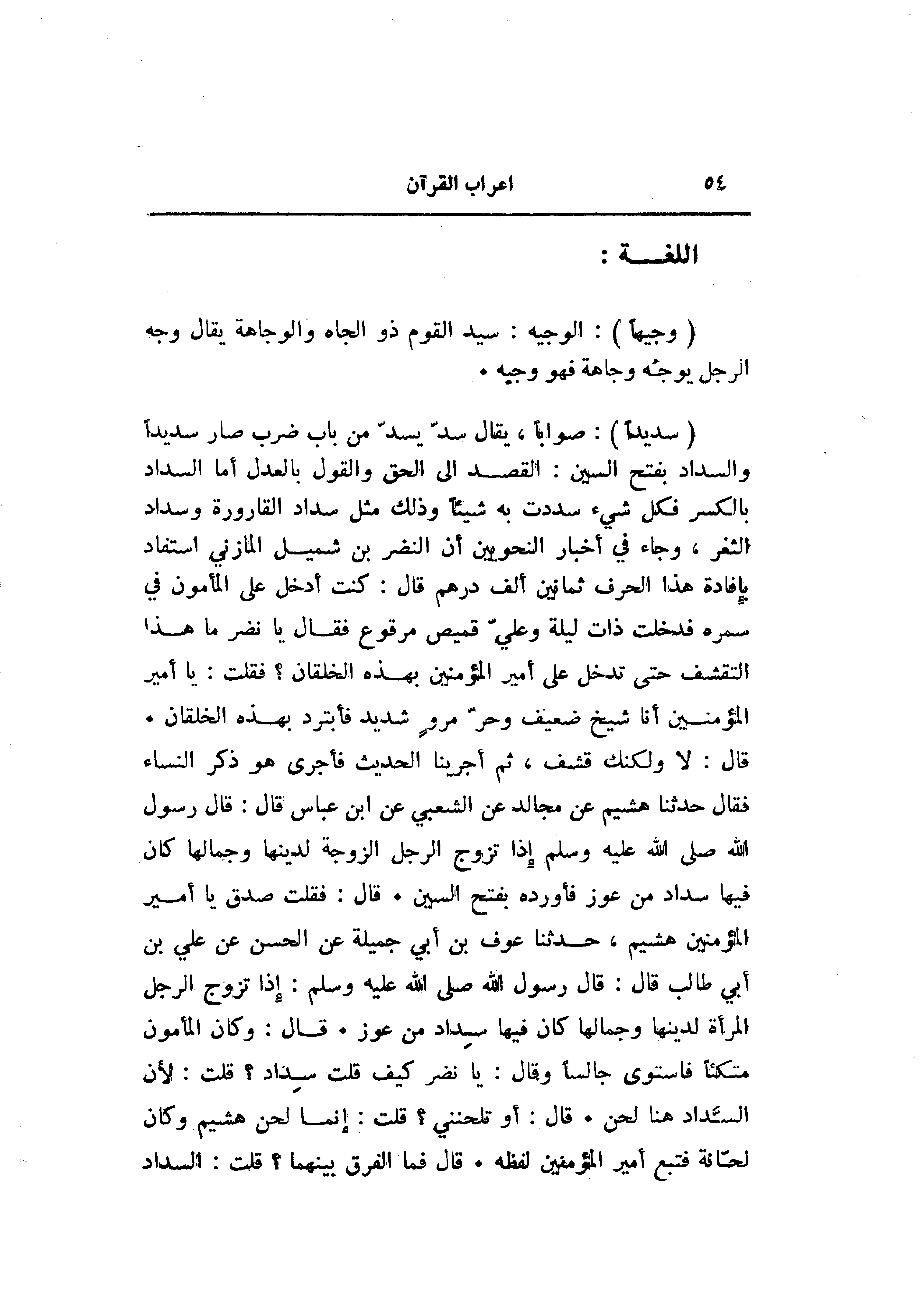 قال: لا ولكنك قشف، ثم أجرينا الحديث فأجرى هو ذكر النساء فقال حدثنا هشيم عن مجالد عن الشعبي عن ابن عباس قال: قال رسول الله صلى الله عليه وسلم إذا تزوج الرجل الزوجة لدينها وجمالها كان فيها سداد من عوز فأورده بفتح السين. قال: فقلت صدق يا أمير المؤمنين هشيم، حدثنا عوف بن أبي جميلة عن الحسن عن علي ابن أبي طالب قال: قال رسول الله صلى الله عليه وسلم: إذا تزوج الرجل المرأة لدينها وجمالها كان فيها سداد من عوز. قال: وكان المأمون متكئا فاستوى جالسا وقال: يا نضر كيف قلت سداد؟ قلت: لأن السّداد هنا لحن. قال: أو تلحنني؟ قلت: إنما لحن هشيم وكان لحّانة فتبع أمير المؤمنين لفظه. قال فما الفرق بينهما؟ قلت: السداد