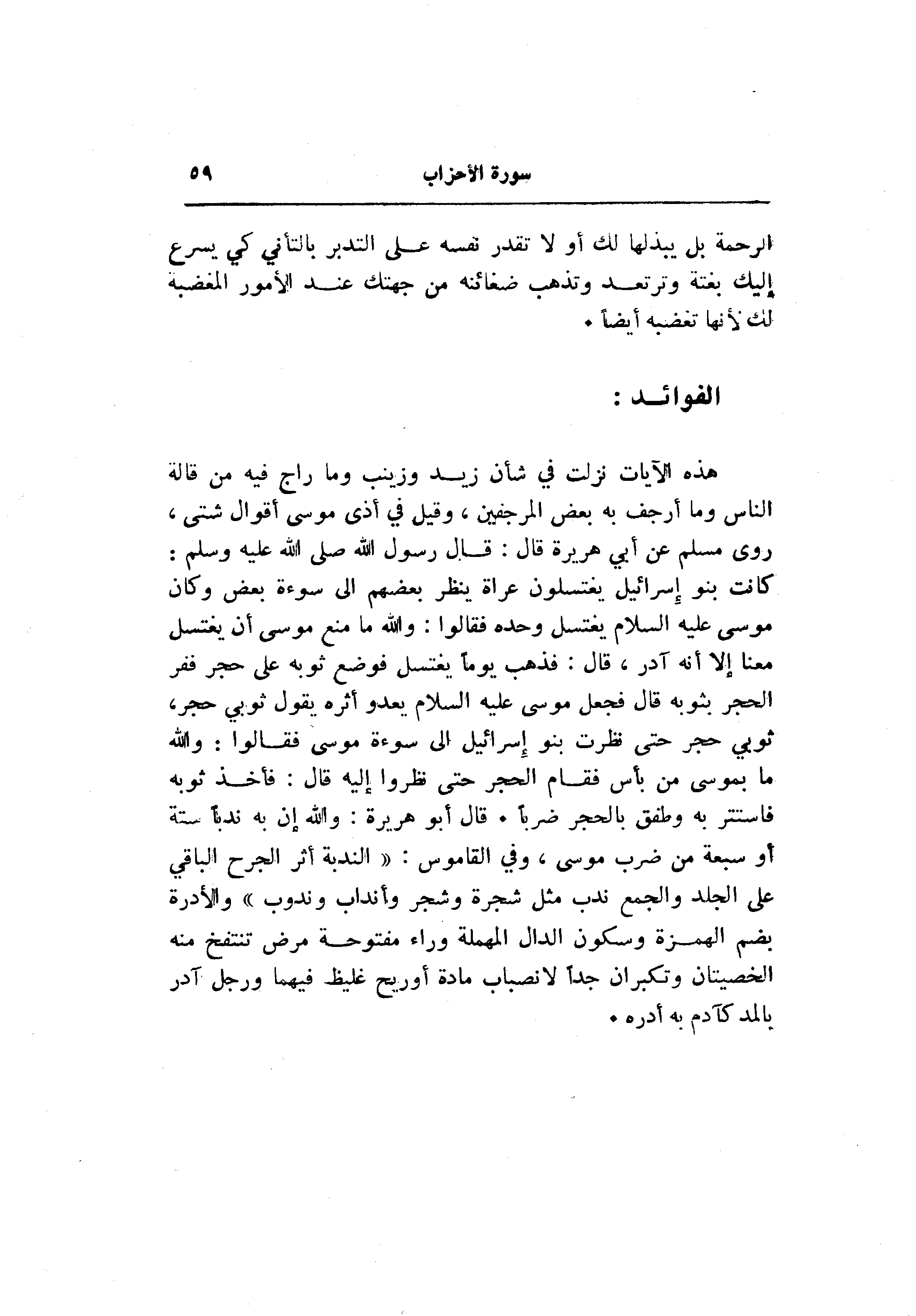 كانت بنو إسرائيل يغتسلون عراة ينظر بعضهم الى سوءة بعض وكان موسى عليه السلام يغتسل وحده فقالوا: والله ما منع موسى أن يغتسل معنا إلا أنه آدر، قال: فذهب يوما يغتسل فوضع ثوبه على حجر ففر الحجر بثوبه قال فجعل موسى عليه السلام يعدو أثره يقول ثوبي حجر، ثوبي حجر حتى نظرت بنو إسرائيل الى سوءة موسى فقالوا: والله ما بموسى من بأس فقام الحجر حتى نظروا إليه قال: فأخذ ثوبه فاستتر به وطفق بالحجر ضربا. قال أبو هريرة: والله إن به ندبا ستة أو سبعة من ضرب موسى، وفي القاموس: «الندبة أثر الجرح الباقي على الجلد والجمع ندب مثل شجرة وشجر وأنداب وندوب» والأدرة بضم الهمزة وسكون الدال المهملة وراء مفتوحة مرض تنتفخ منه الخصيتان وتكبران جدا لانصباب مادة أو ريح غليظ فيهما ورجل آدر بالمد كآدم به أدره.