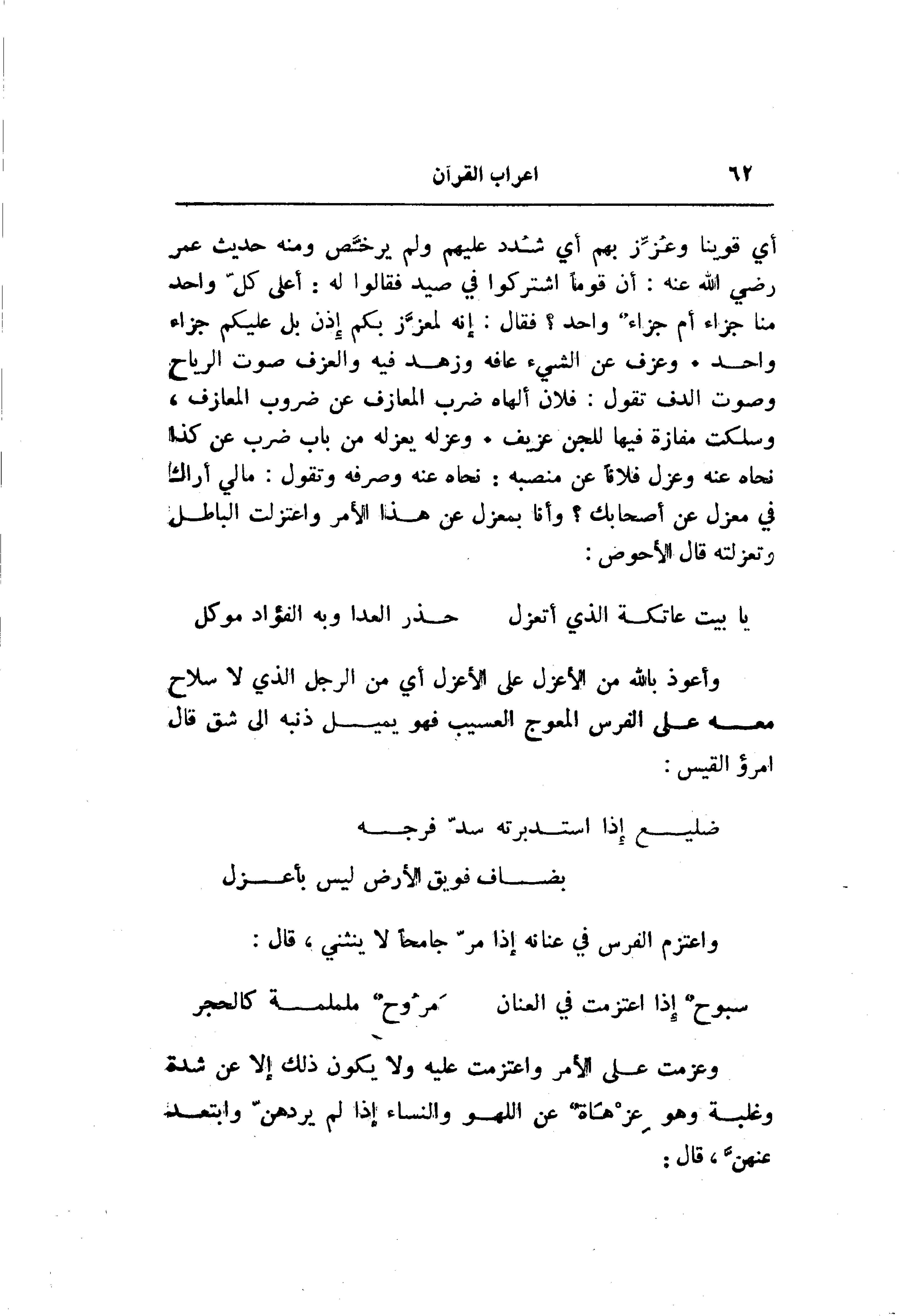 أي قوينا وعزّز بهم أي شدد عليهم ولم يرخّص ومنه حديث عمر رضي الله عنه: أن قوما اشتركوا في صيد فقالوا له: أعلى كلّ واحد منا جزاء أم جزاء واحد؟ فقال: إنه لمعزّز بكم إذن بل عليكم جزاء واحد. وعزف عن الشيء عافه وزهد فيه والعزف صوت الرياح وصوت الدف تقول: فلان ألهاه ضرب المعازف عن ضروب المعازف، وسلكت مفازة فيها للجن عزيف. وعزله يعزله من باب ضرب عن كذا نحاه عنه وعزل فلانا عن منصبه: نحاه عنه وصرفه وتقول: مالي أراك في معزل عن أصحابك؟ وأنا بمعزل عن هذا الأمر واعتزلت الباطل وتعزلته قال الأحوص: