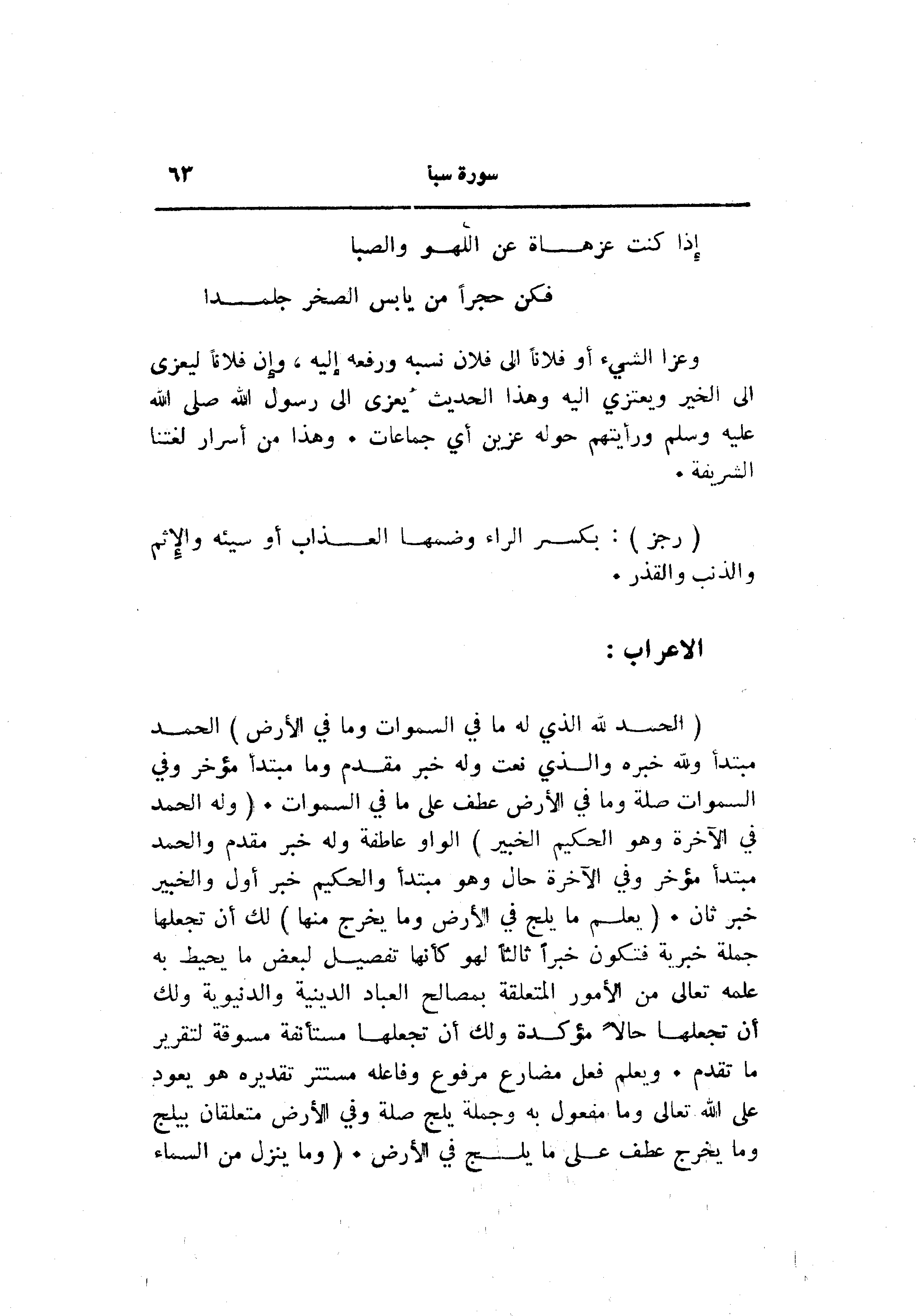 (الْحَمْدُ لِلَّهِ الَّذِي لَهُ ما فِي السَّماواتِ وَما فِي الْأَرْضِ) الحمد مبتدأ ولله خبره والذي نعت وله خبر مقدم وما مبتدأ مؤخر وفي السموات صلة وما في الأرض عطف على ما في السموات. (وَلَهُ الْحَمْدُ فِي الْآخِرَةِ وَهُوَ الْحَكِيمُ الْخَبِيرُ) الواو عاطفة وله خبر مقدم والحمد مبتدأ مؤخر وفي الآخرة حال وهو مبتدأ والحكيم خبر أول والخبير خبر ثان. (يَعْلَمُ ما يَلِجُ فِي الْأَرْضِ وَما يَخْرُجُ مِنْها) لك أن تجعلها جملة خبرية فتكون خبرا ثالثا لهو كأنها تفصيل لبعض ما يحيط به علمه تعالى من الأمور المتعلقة بمصالح العباد الدينية والدنيوية ولك أن تجعلها حالا مؤكدة ولك أن تجعلها مستأنفة مسوقة لتقرير ما تقدم. ويعلم فعل مضارع مرفوع وفاعله مستتر تقديره هو يعود على الله تعالى وما مفعول به وجملة يلج صلة وفي الأرض متعلقان بيلج وما يخرج عطف على ما يلج في الأرض. (وَما يَنْزِلُ مِنَ السَّماءِ