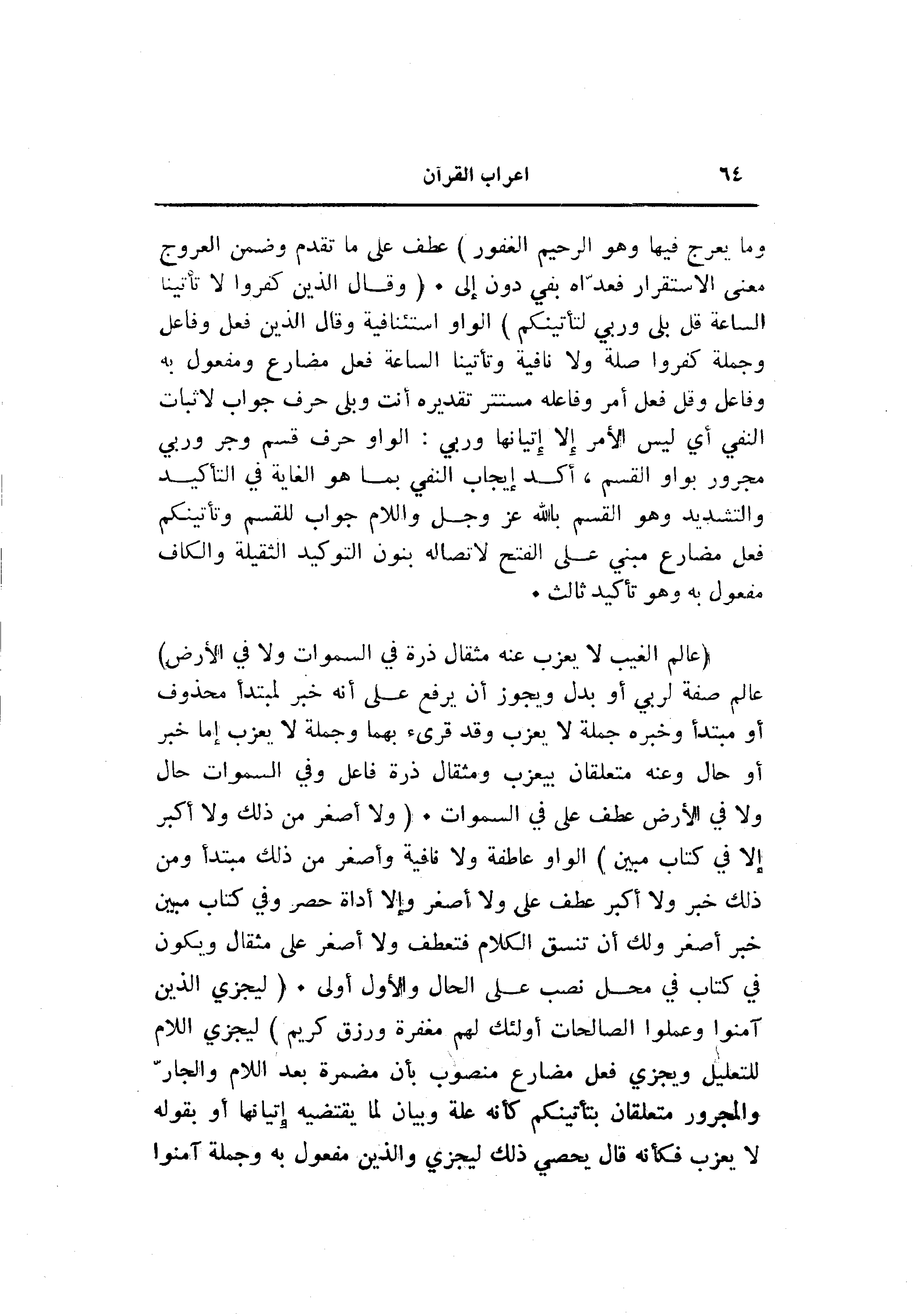 (عالِمِ الْغَيْبِ لا يَعْزُبُ عَنْهُ مِثْقالُ ذَرَّةٍ فِي السَّماواتِ وَلا فِي الْأَرْضِ) عالم صفة لربي أو بدل ويجوز أن يرفع على أنه خبر لمبتدأ محذوف أو مبتدأ وخبره جملة لا يعزب وقد قرىء بهما وجملة لا يعزب إما خبر أو حال وعنه متعلقان بيعزب ومثقال ذرة فاعل وفي السموات حال ولا في الأرض عطف على في السموات. (وَلا أَصْغَرُ مِنْ ذلِكَ وَلا أَكْبَرُ إِلَّا فِي كِتابٍ مُبِينٍ) الواو عاطفة ولا نافية وأصغر من ذلك مبتدأ ومن ذلك خبر ولا أكبر عطف على ولا أصغر وإلا أداة حصر وفي كتاب مبين خبر أصغر ولك أن تنسق الكلام فتعطف ولا أصغر على مثقال ويكون في كتاب في محل نصب على الحال والأول أولى. (لِيَجْزِيَ الَّذِينَ آمَنُوا وَعَمِلُوا الصَّالِحاتِ أُولئِكَ لَهُمْ مَغْفِرَةٌ وَرِزْقٌ كَرِيمٌ) ليجزي اللام للتعليل ويجزي فعل مضارع منصوب بأن مضمرة بعد اللام والجارّ والمجرور متعلقان بتأتينكم كأنه علة وبيان لما يقتضيه إتيانها أو بقوله لا يعزب فكأنه قال يحصي ذلك ليجزي والذين مفعول به وجملة آمنوا