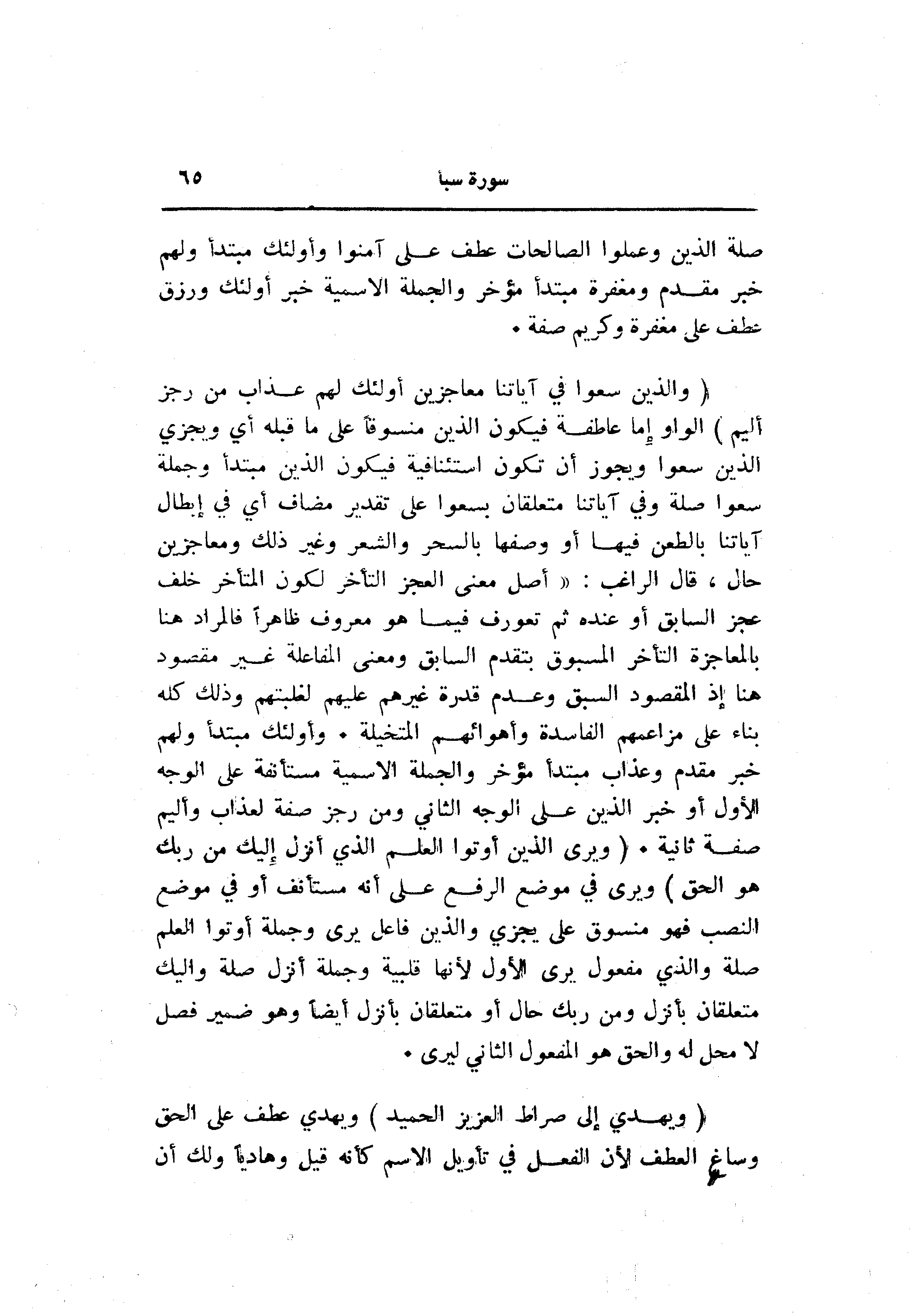(وَالَّذِينَ سَعَوْا فِي آياتِنا مُعاجِزِينَ أُولئِكَ لَهُمْ عَذابٌ مِنْ رِجْزٍ أَلِيمٌ) الواو إما عاطفة فيكون الذين منسوقا على ما قبله أي ويجزي الذين سعوا ويجوز أن تكون استئنافية فيكون الذين مبتدأ وجملة سعوا صلة وفي آياتنا متعلقان بسعوا على تقدير مضاف أي في إبطال آياتنا بالطعن فيها أو وصفها بالسحر والشعر وغير ذلك ومعاجزين حال، قال الراغب: «أصل معنى العجز التأخر لكون المتأخر خلف عجز السابق أو عنده ثم تعورف فيما هو معروف ظاهرا فالمراد هنا بالمعاجزة التأخر المسبوق بتقدم السابق ومعنى المفاعلة غير مقصود هنا إذ المقصود السبق وعدم قدرة غيرهم عليهم لغلبتهم وذلك كله بناء على مزاعمهم الفاسدة وأهوائهم المتخيلة. وأولئك مبتدأ ولهم خبر مقدم وعذاب مبتدأ مؤخر والجملة الاسمية مستأنفة على الوجه الأول أو خبر الذين على الوجه الثاني ومن رجز صفة لعذاب وأليم صفة ثانية. (وَيَرَى الَّذِينَ أُوتُوا الْعِلْمَ الَّذِي أُنْزِلَ إِلَيْكَ مِنْ رَبِّكَ هُوَ الْحَقَّ) ويرى في موضع الرفع على أنه مستأنف أو في موضع النصب فهو منسوق على يجزي والذين فاعل يرى وجملة أوتوا العلم صلة والذي مفعول يرى الأول لأنها قلبية وجملة أنزل صلة وإليك متعلقان بأنزل ومن ربك حال أو متعلقان بأنزل أيضا وهو ضمير فصل لا محل له والحق هو المفعول الثاني ليرى.