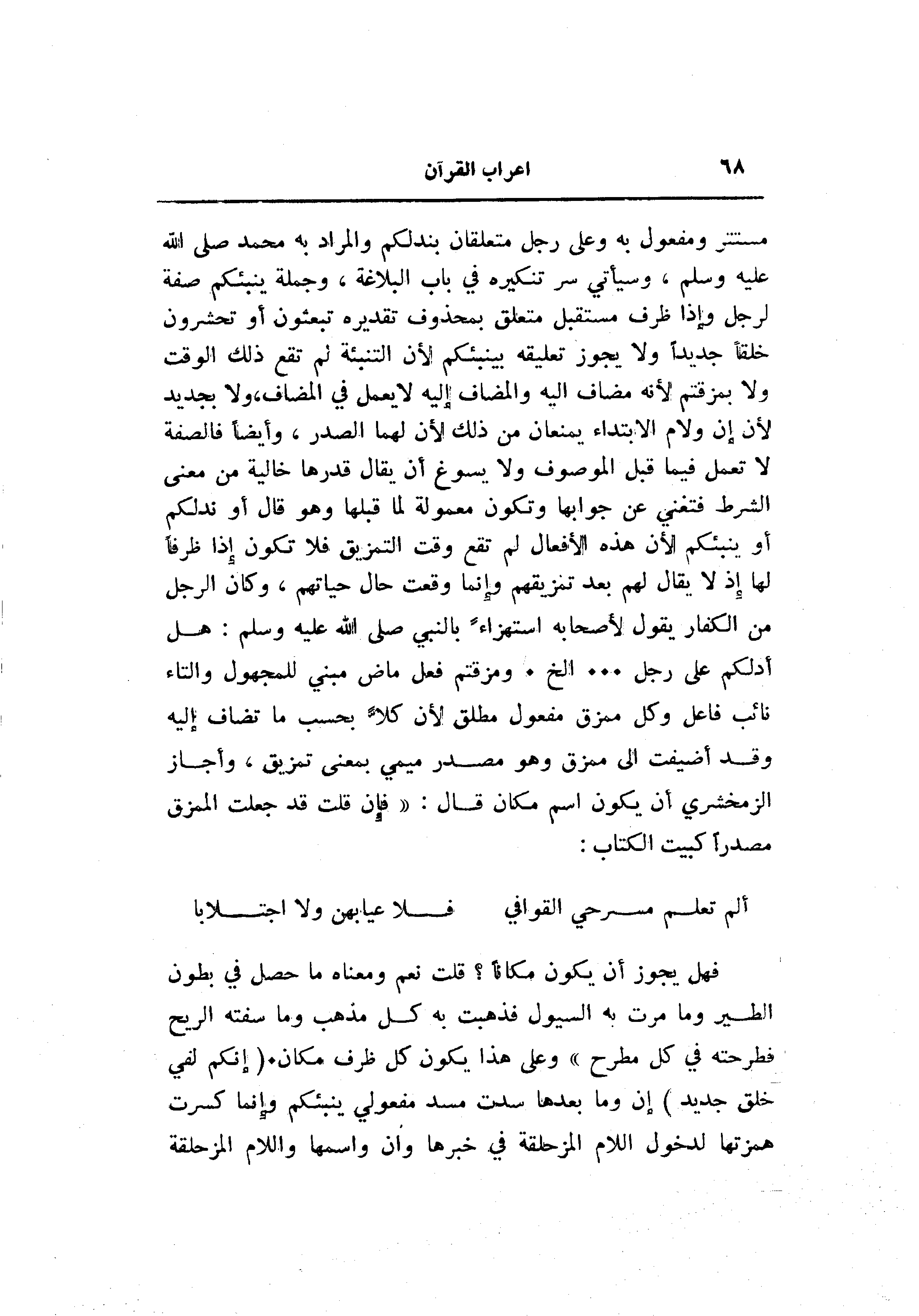 مستتر ومفعول به وعلى رجل متعلقان بندلكم والمراد به محمد صلى الله عليه وسلم، وسيأتي سر تنكيره في باب البلاغة، وجملة ينبئكم صفة لرجل وإذا ظرف مستقبل متعلق بمحذوف تقديره تبعثون أو تحشرون خلفا جديدا ولا يجوز تعليقه بينبئكم لأن التنبئة لم تقع ذلك الوقت ولا بمزقتم لأنه مضاف اليه والمضاف إليه لا يعمل في المضاف، ولا بجديد لأن إن ولام الابتداء يمنعان من ذلك لأن لهما الصدر، وأيضا فالصفة لا تعمل فيما قبل الموصوف ولا يسوغ أن يقال قدرها خالية من معنى الشرط فتغني عن جوابها وتكون معمولة لما قبلها وهو قال أو ندلكم أو ينبئكم لأن هذه الأفعال لم تقع وقت التمزيق فلا تكون إذا ظرفا لها إذ لا يقال لهم بعد تمزيقهم وإنما وقعت حال حياتهم، وكان الرجل من الكفار يقول لأصحابه استهزاء بالنبي صلى الله عليه وسلم: هل أدلكم على رجل ... إلخ. ومزقتم فعل ماض مبني للمجهول والتاء نائب فاعل وكل ممزق مفعول مطلق لأن كلّا بحسب ما تضاف إليه وقد أضيفت الى ممزق وهو مصدر ميمي بمعنى تمزيق، وأجاز الزمخشري أن يكون اسم مكان قال: «فإن قلت قد جعلت الممزق مصدرا كبيت الكتاب: