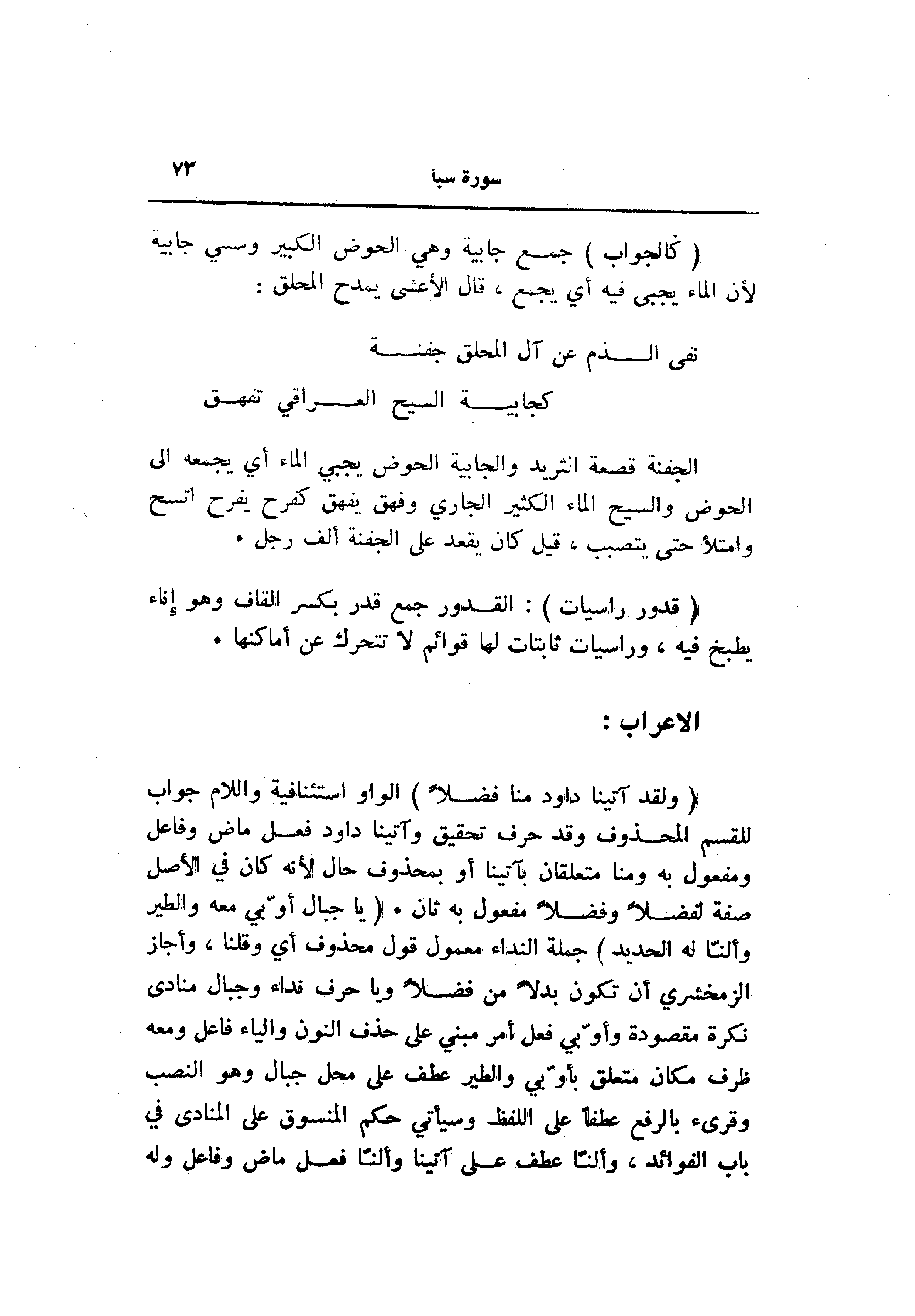 (وَلَقَدْ آتَيْنا داوُدَ مِنَّا فَضْلًا) الواو استئنافية واللام جواب للقسم المحذوف وقد حرف تحقيق وآتينا داود فعل ماض وفاعل ومفعول به ومنا متعلقان بآتينا أو بمحذوف حال لأنه كان في الأصل صفة لفضلا وفضلا مفعول به ثان. (يا جِبالُ أَوِّبِي مَعَهُ وَالطَّيْرَ وَأَلَنَّا لَهُ الْحَدِيدَ) جملة النداء معمول قول محذوف أي وقلنا، وأجاز الزمخشري أن تكون بدلا من فضلا ويا حرف نداء وجبال منادى نكرة مقصودة وأوّبي فعل أمر مبني على حذف النون والياء فاعل ومعه ظرف مكان متعلق بأوّبي والطير عطف على محل جبال وهو النصب وقرىء بالرفع عطفا على اللفظ وسيأتي حكم المنسوق على المنادى في باب الفوائد، وألنّا عطف على آتينا وألنّا فعل ماض وفاعل وله