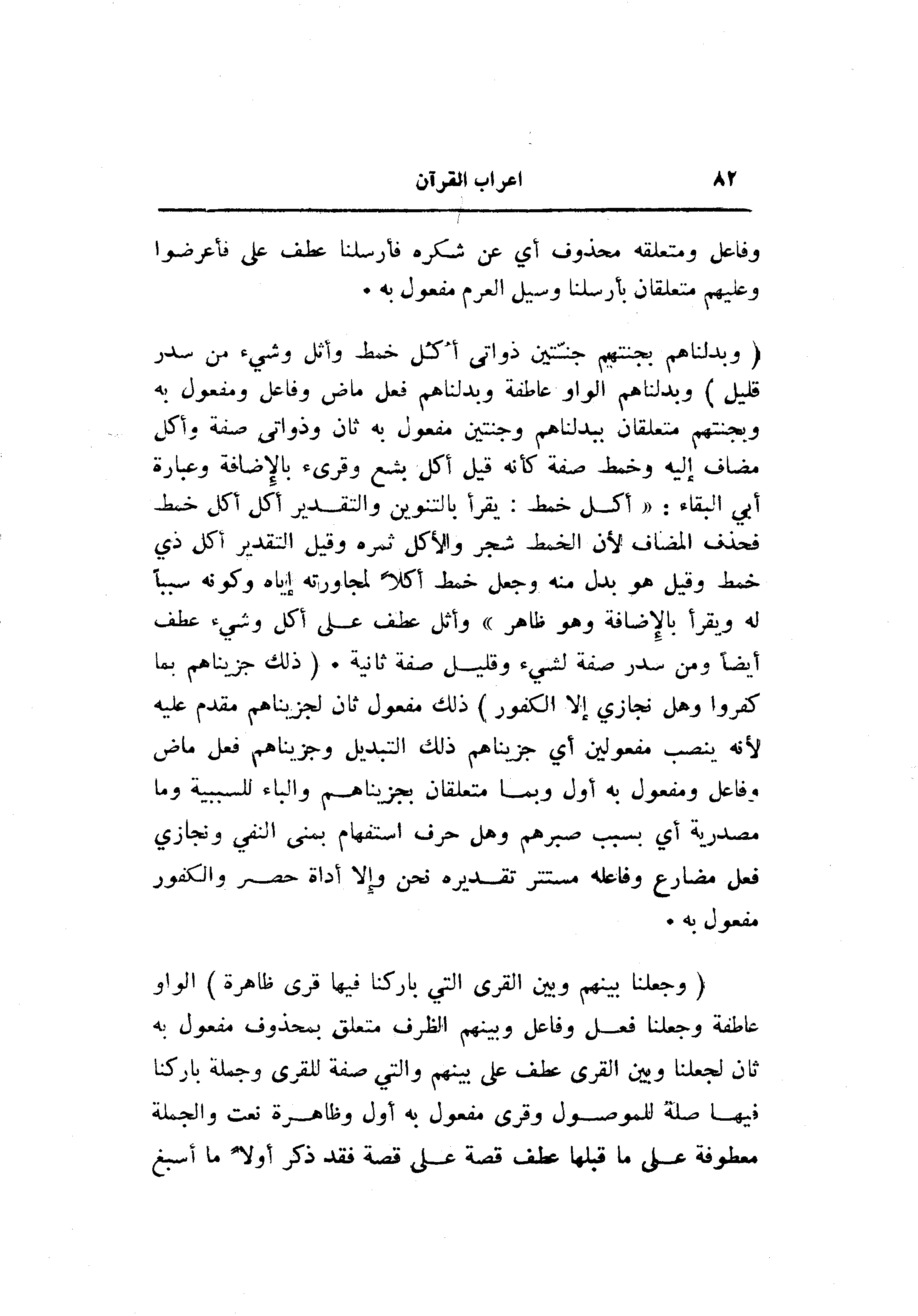 (وَبَدَّلْناهُمْ بِجَنَّتَيْهِمْ جَنَّتَيْنِ ذَواتَيْ أُكُلٍ خَمْطٍ وَأَثْلٍ وَشَيْءٍ مِنْ سِدْرٍ قَلِيلٍ) وبدلناهم الواو عاطفة وبدلناهم فعل ماض وفاعل ومفعول به وبجنتهم متعلقان ببدلناهم وجنتين مفعول به ثان وذواتى صفة وأكل مضاف إليه وخمط صفة كأنه قيل أكل بشع وقرىء بالإضافة وعبارة أبي البقاء: «أكل خمط: يقرأ بالتنوين والتقدير أكل أكل خمط فحذف المضاف لأن الخمط شجر والأكل ثمره وقيل التقدير أكل ذي خمط وقيل هو بدل منه وجعل خمط أكلا لمجاورته إياه وكونه سببا له ويقرأ بالإضافة وهو ظاهر» وأثل عطف على أكل وشيء عطف أيضا ومن سدر صفة لشيء وقليل صفة ثانية. (ذلِكَ جَزَيْناهُمْ بِما كَفَرُوا وَهَلْ نُجازِي إِلَّا الْكَفُورَ) ذلك مفعول ثان لجزيناهم مقدم عليه لأنه ينصب مفعولين أي جزيناهم ذلك التبديل وجزيناهم فعل ماض وفاعل ومفعول به أول وبما متعلقان بجزيناهم والباء للسببية وما مصدرية أي بسبب صبرهم وهل حرف استفهام بمنى النفي ونجازي فعل مضارع وفاعله مستتر تقديره نحن وإلا أداة حصر والكفور مفعول به.