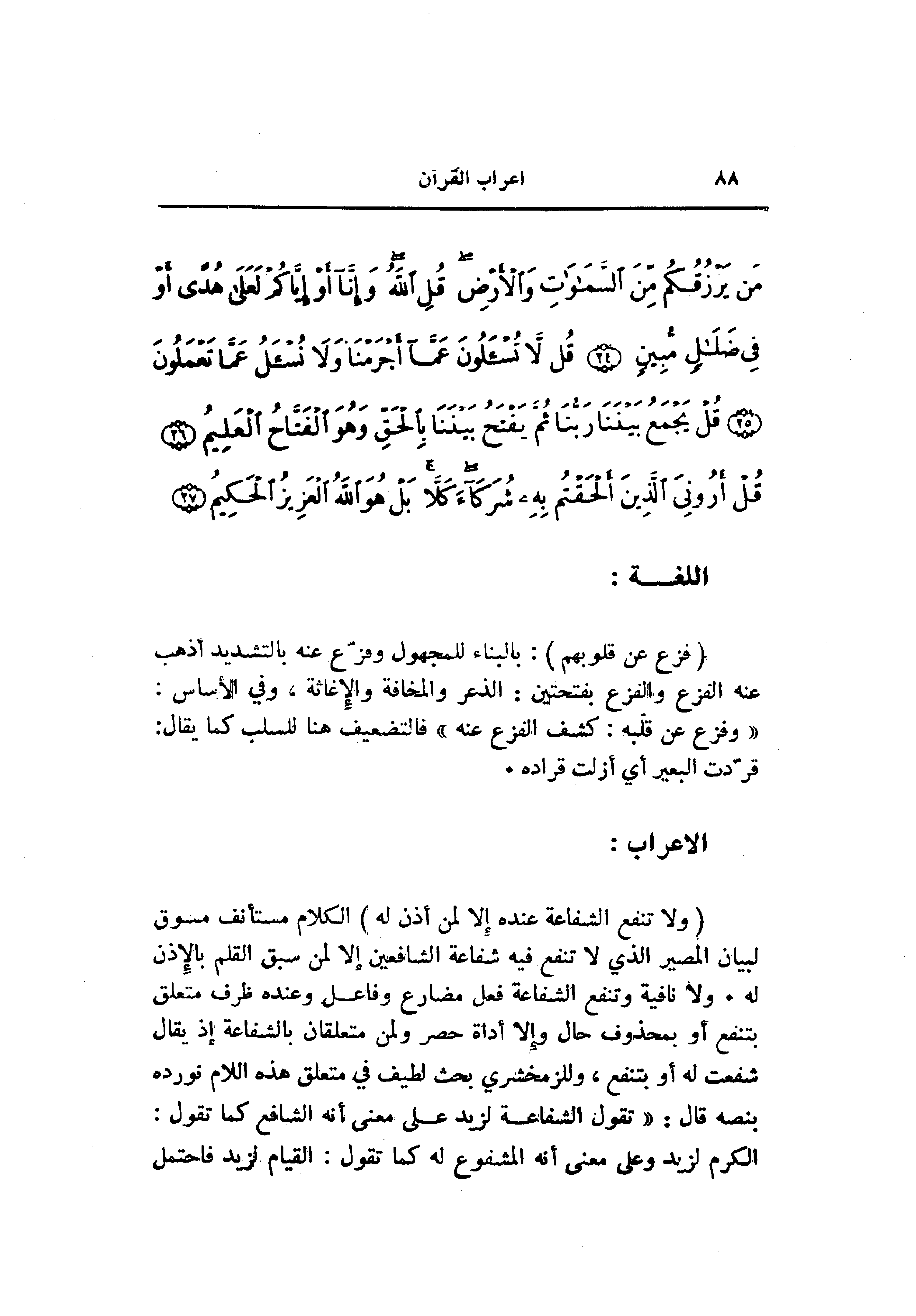 (وَلا تَنْفَعُ الشَّفاعَةُ عِنْدَهُ إِلَّا لِمَنْ أَذِنَ لَهُ) الكلام مستأنف مسوق لبيان المصير الذي لا تنفع فيه شفاعة الشافعين إلا لمن سبق القلم بالإذن له. ولا نافية وتنفع الشفاعة فعل مضارع وفاعل وعنده ظرف متعلق بتنفع أو بمحذوف حال وإلا أداة حصر ولمن متعلقان بالشفاعة إذ يقال شفعت له أو بتنفع، وللزمخشري بحث لطيف في متعلق هذه اللام نورده بنصه قال: «تقول الشفاعة لزيد على معنى أنه الشافع كما تقول:
