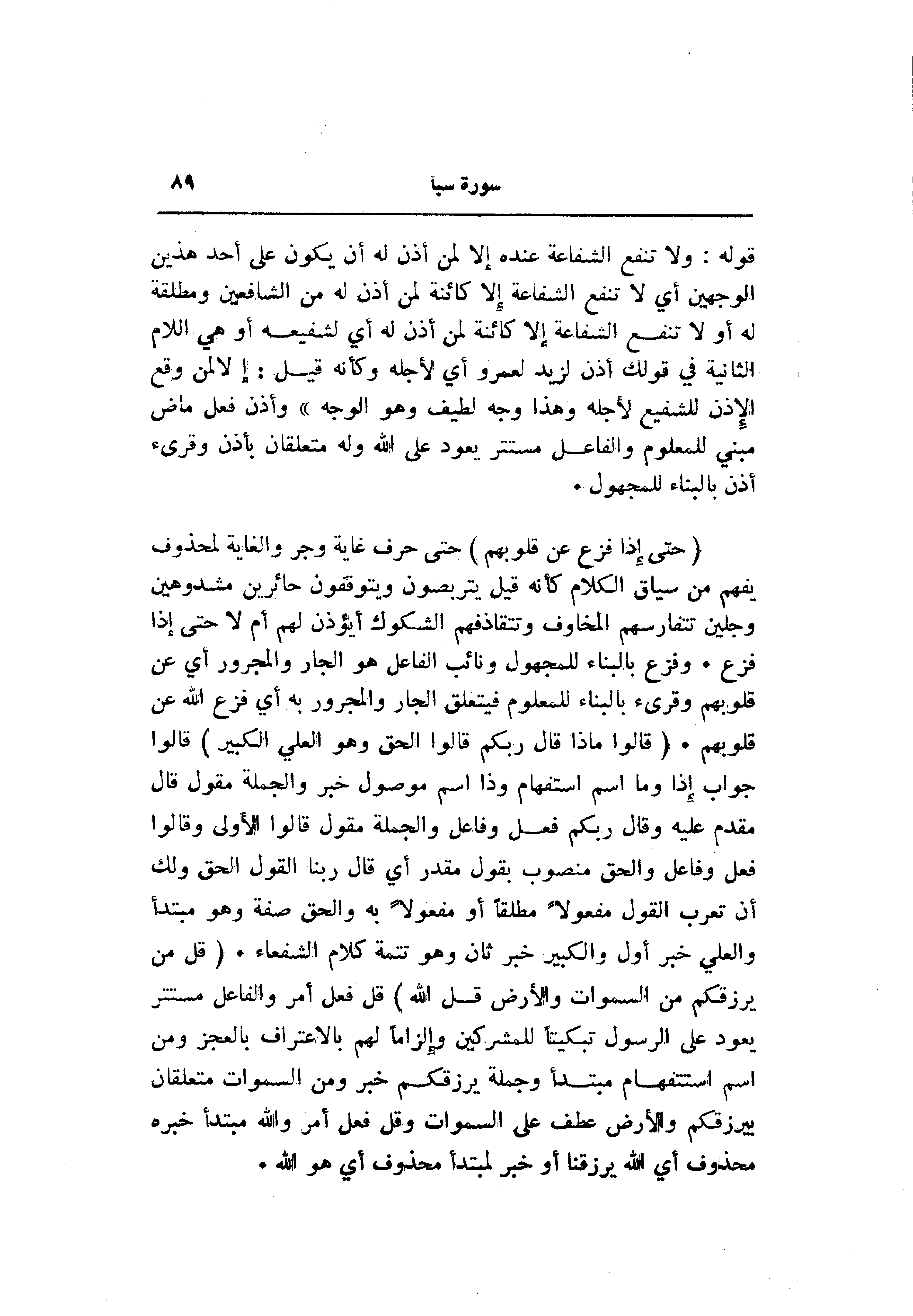 (حَتَّى إِذا فُزِّعَ عَنْ قُلُوبِهِمْ) حتى حرف غاية وجر والغاية لمحذوف يفهم من سياق الكلام كأنه قيل يتربصون ويتوفقون حائرين مشدوهين وجلين تتفارسهم المخاوف وتتقاذفهم الشكوك أيؤذن لهم أم لا حتى إذا فزع. وفزع بالبناء للمجهول ونائب الفاعل هو الجار والمجرور أي عن قلوبهم وقرىء بالبناء للمعلوم فيتعلق الجار والمجرور به أي فزع الله عن قلوبهم. (قالُوا ماذا قالَ رَبُّكُمْ قالُوا الْحَقَّ وَهُوَ الْعَلِيُّ الْكَبِيرُ) قالوا جواب إذا وما اسم استفهام وذا اسم موصول خبر والجملة مقول قال مقدم عليه وقال ربكم فعل وفاعل والجملة مقول قالوا الأولى وقالوا فعل وفاعل والحق منصوب بقول مقدر أي قال ربنا القول الحق ولك أن تعرب القول مفعولا مطلقا أو مفعولا به والحق صفة وهو مبتدأ والعلي خبر أول والكبير خبر ثان وهو تتمة كلام الشفعاء. (قُلْ مَنْ يَرْزُقُكُمْ مِنَ السَّماواتِ وَالْأَرْضِ قُلِ اللَّهُ) قل فعل أمر والفاعل مستتر يعود على الرسول تبكيتا للمشركين وإلزاما لهم بالاعتراف بالعجز ومن اسم استفهام مبتدأ وجملة يرزقكم خبر ومن السموات متعلقان يرزقكم والأرض عطف على السموات وقل فعل أمر والله مبتدأ خبره محذوف أي الله يرزقنا أو خبر لمبتدأ محذوف أي هو الله.