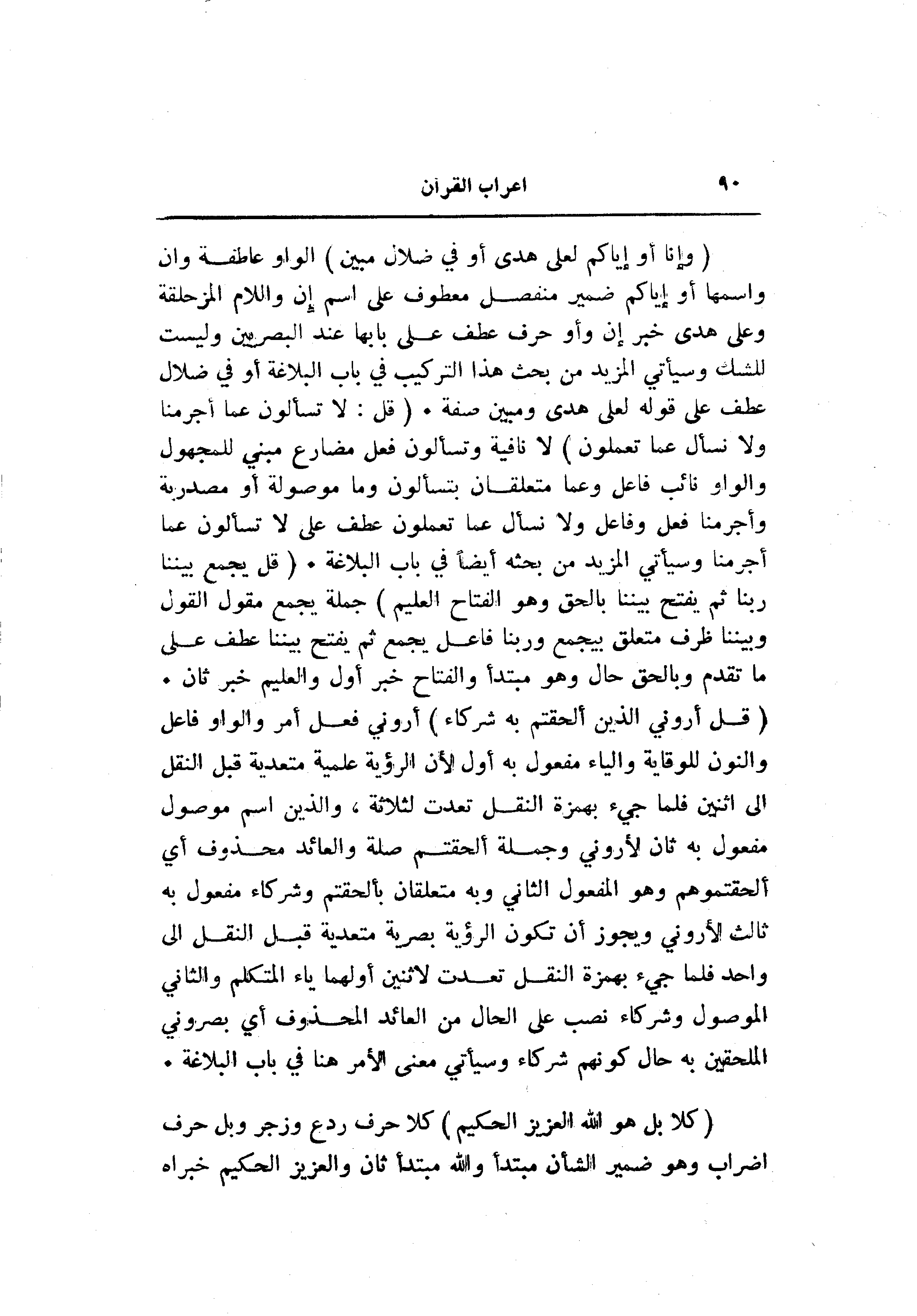 (وَإِنَّا أَوْ إِيَّاكُمْ لَعَلى هُدىً أَوْ فِي ضَلالٍ مُبِينٍ) الواو عاطفة وان واسمها أو إياكم ضمير منفصل معطوف على اسم إن واللام المزحلقة وعلى هدى خبر إن وأو حرف عطف على بابها عند البصريين وليست للشك وسيأتي المزيد من بحث هذا التركيب في باب البلاغة أو في ضلال عطف على قوله لعلى هدى ومبين صفة. (قُلْ: لا تُسْئَلُونَ عَمَّا أَجْرَمْنا وَلا نُسْئَلُ عَمَّا تَعْمَلُونَ) لا نافية وتسألون فعل مضارع مبني للمجهول والواو نائب فاعل وعما متعلقان بتسألون وما موصولة أو مصدرية وأجرمنا فعل وفاعل ولا نسأل عما تعملون عطف على لا تسألون عما أجرمنا وسيأتي المزيد من بحثه أيضا في باب البلاغة. (قُلْ يَجْمَعُ بَيْنَنا رَبُّنا ثُمَّ يَفْتَحُ بَيْنَنا بِالْحَقِّ وَهُوَ الْفَتَّاحُ الْعَلِيمُ) جملة يجمع مقول القول وبيننا ظرف متعلق بيجمع وربنا فاعل يجمع ثم يفتح بيننا عطف على ما تقدم وبالحق حال وهو مبتدأ والفتاح خبر أول والعليم خبر ثان.