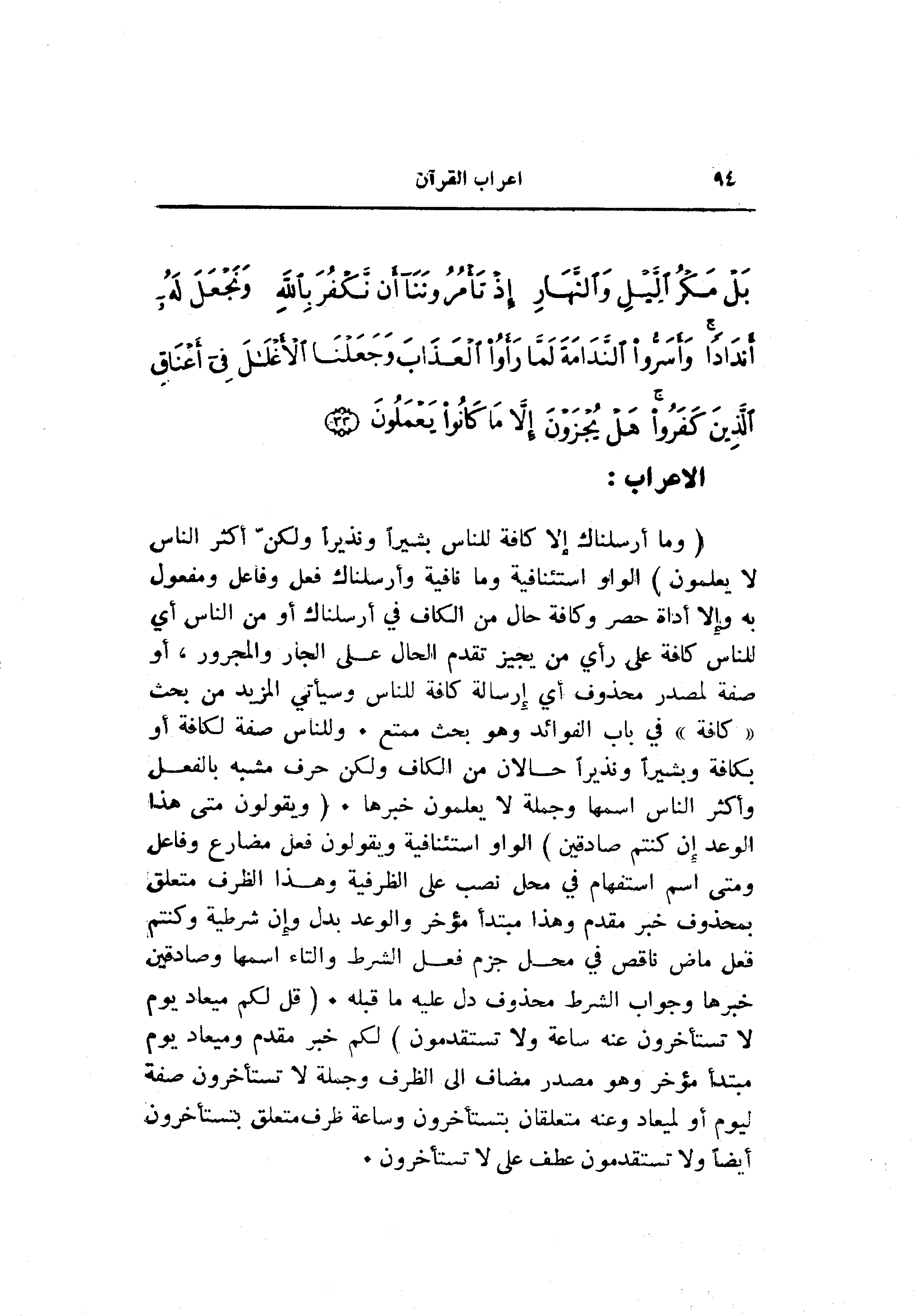 (وَما أَرْسَلْناكَ إِلَّا كَافَّةً لِلنَّاسِ بَشِيراً وَنَذِيراً وَلكِنَّ أَكْثَرَ النَّاسِ لا يَعْلَمُونَ) الواو استئنافية وما نافية وأرسلناك فعل وفاعل ومفعول به وإلا أداة حصر وكافة حال من الكاف في أرسلناك أو من الناس أي للناس كافة على رأي من يجيز تقدم الحال على الجار والمجرور، أو صفة لمصدر محذوف أي إرسالة كافة للناس وسيأتي المزيد من بحث «كافة» في باب الفوائد وهو بحث ممتع. وللناس صفة لكافة أو بكافة وبشيرا ونذيرا حالان من الكاف ولكن حرف مشبه بالفعل وأكثر الناس اسمها وجملة لا يعلمون خبرها. (وَيَقُولُونَ مَتى هذَا الْوَعْدُ إِنْ كُنْتُمْ صادِقِينَ) الواو استئنافية ويقولون فعل مضارع وفاعل ومتى اسم استفهام في محل نصب على الظرفية وهذا الظرف متعلق بمحذوف خبر مقدم وهذا مبتدأ مؤخر والوعد بدل وإن شرطية وكنتم فعل ماض ناقص في محل جزم فعل الشرط والتاء اسمها وصادقين خبرها وجواب الشرط محذوف دل عليه ما قبله. (قُلْ لَكُمْ مِيعادُ يَوْمٍ لا تَسْتَأْخِرُونَ عَنْهُ ساعَةً وَلا تَسْتَقْدِمُونَ) لكم خبر مقدم وميعاد يوم مبتدأ مؤخر وهو مصدر مضاف إلى الظرف وجملة لا تستأخرون صفة ليوم أو لميعاد وعنه متعلقان بتستأخرون وساعة ظرف متعلق بتستأخرون أيضا ولا تستقدمون عطف على لا تستأخرون.