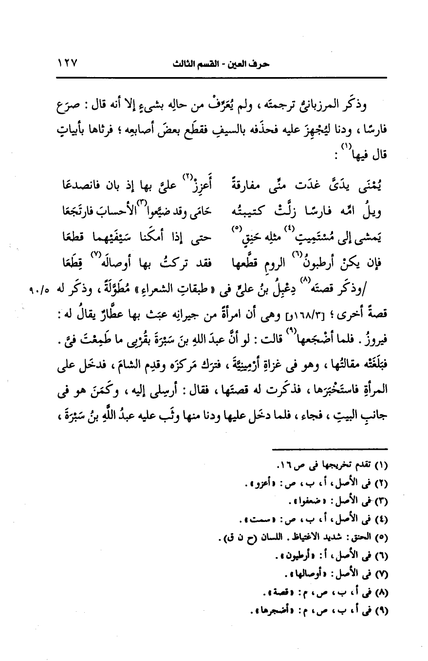 وذكر قصة دعبل بن علي في طبقات الشعراء مطولة وذكر له قصة أخرى وهي ان امرأة من جيرأنه عبث بها عطار يُقَالُ لَهُ: فيروز فلما اضجرها قالت لو ان عَبد الله بن سبرة بقربى ما طمعت في فبلغته مقالتها وهو في غزاة أرمينية فترك مركزه وقدم الشام فدخل على المرأة فاستخبرها فذكرت له قصتها فقال ارسلي اليه وكمن هو في جانب البيت فجاء فلما دخل عليها ودنا منها وثب عليه عَبد الله بن سبرة فقتله ورجع إلى مكأنه من غزاته ولم يعلم بذلك أحد.