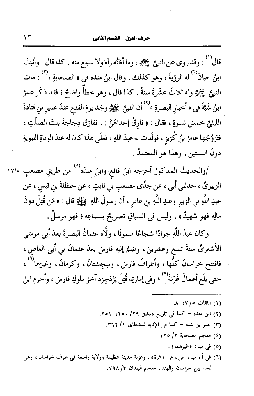 كَذا قَال وهو خطأ واضح فقد ذكر عمر بن شبة في أخبار البصرة أَنَّ النَّبِيَّ صَلى الله عَلَيه وسَلم وعلى آله وسلم وجد يوم الفتح عند عمير بن قتادة الليثي خمس نسوة فقال فارق أحداهن ففارق دجاجة بنت الصلت فتزوجها عامر بن كريز فولدت له عَبد الله فعلى هذا كان له عند الوفاة النبوية دون السنتين وهذا هو المعتمد.