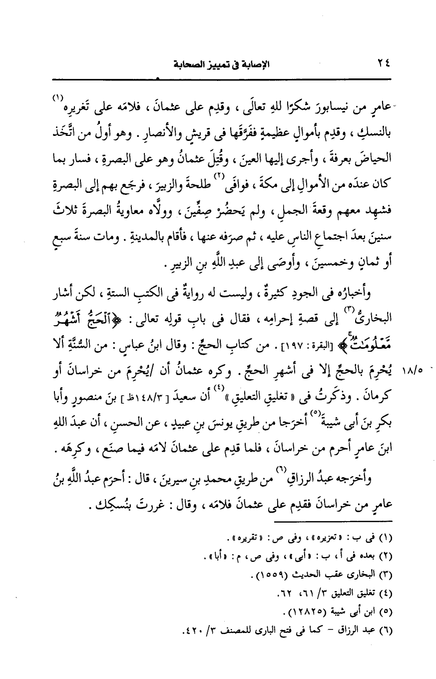 وأَخرجه عبد الرزاق من طريق محمد بن سيرين قال احرم عَبد الله بن عامر من خراسان فقدم على عثمان فلامه وقال غررت بنسكك.