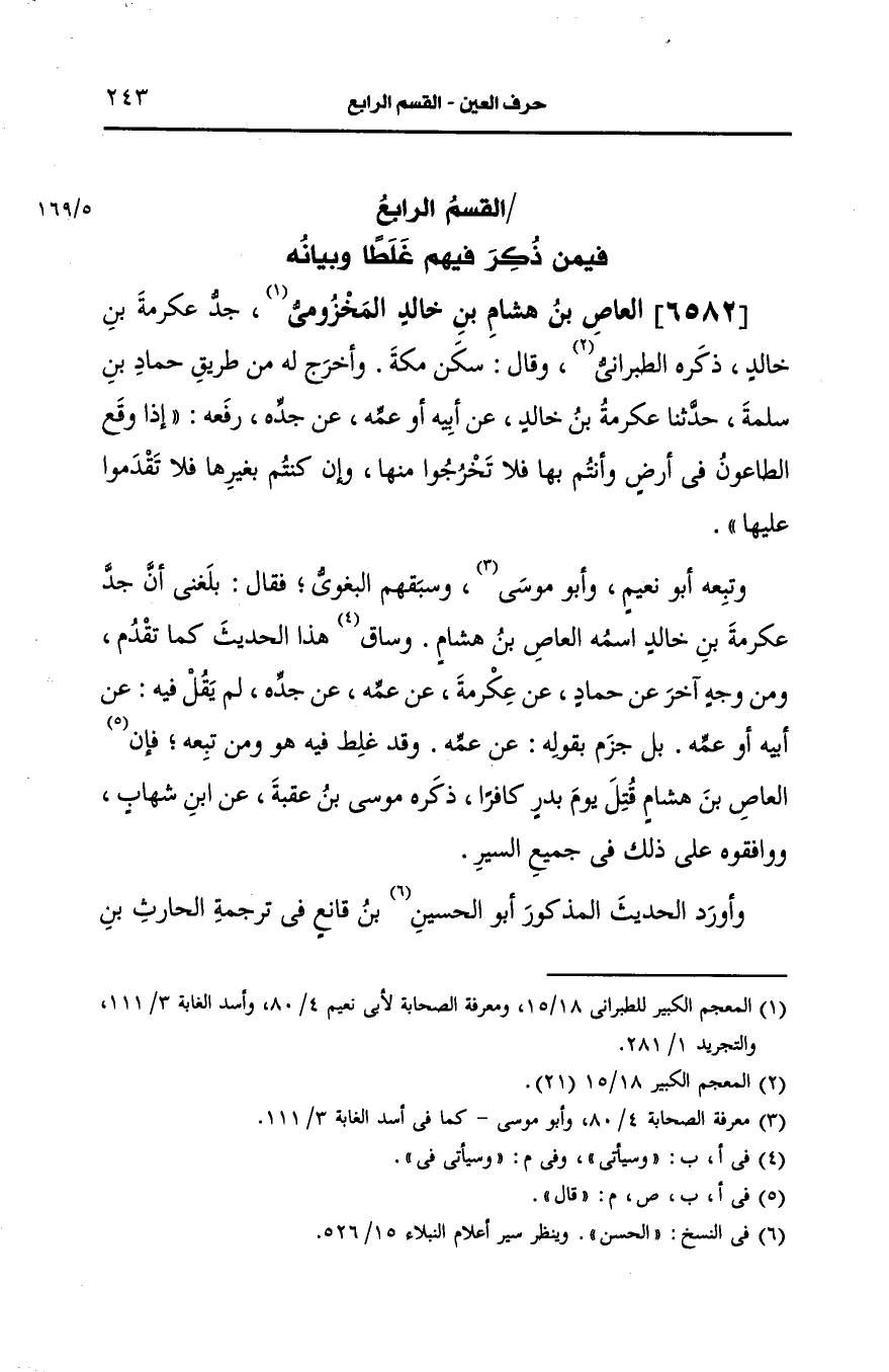 وتبعه أَبو نعيم، وأَبو موسى وسبقهم البغوي فقال بلغني ان جد عكرمة بن خالد اسمه العاص بن هشام وسيأتي في هذا الحديث كما تقدم من وجه آخر، عَن حماد، عَن عكرمة، عَن عمه، عَن جَدِّه لم يقل فيه، عَن أَبيه أو عمه بل جزم بقوله، عَن عمه وقد غلط فيه هو ومن تبعه.