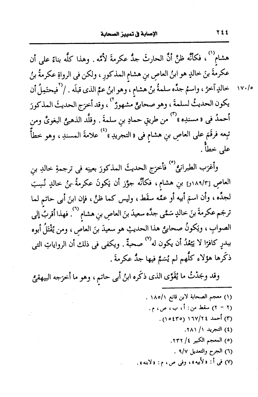 وأغرب الطبراني فاخرج الحديث المذكور بعينه في ترجمة خالد بن العاص بن هشام فكأنه جوز ان يكون عكرمة بن خالد نسب لجده وان اسم أَبيه أو عمه سقط وليس كما ظن قال ابنُ أَبِي حاتم: لما ترجم عكرمة بن خالد سمى جده سعيد بن العاص بن هشام فهذا أقرب إلى الصواب ويكون صحابي هذا الحديث هو سعيد بن العاص ومن يقتل أبوه ببدر كافرا لا يبعد ان يكون لابنه صحبة ويكفي في ذلك ان الروايات التي ذكرها هؤلاء كلهم لم يسم فيها جد عكرمة.