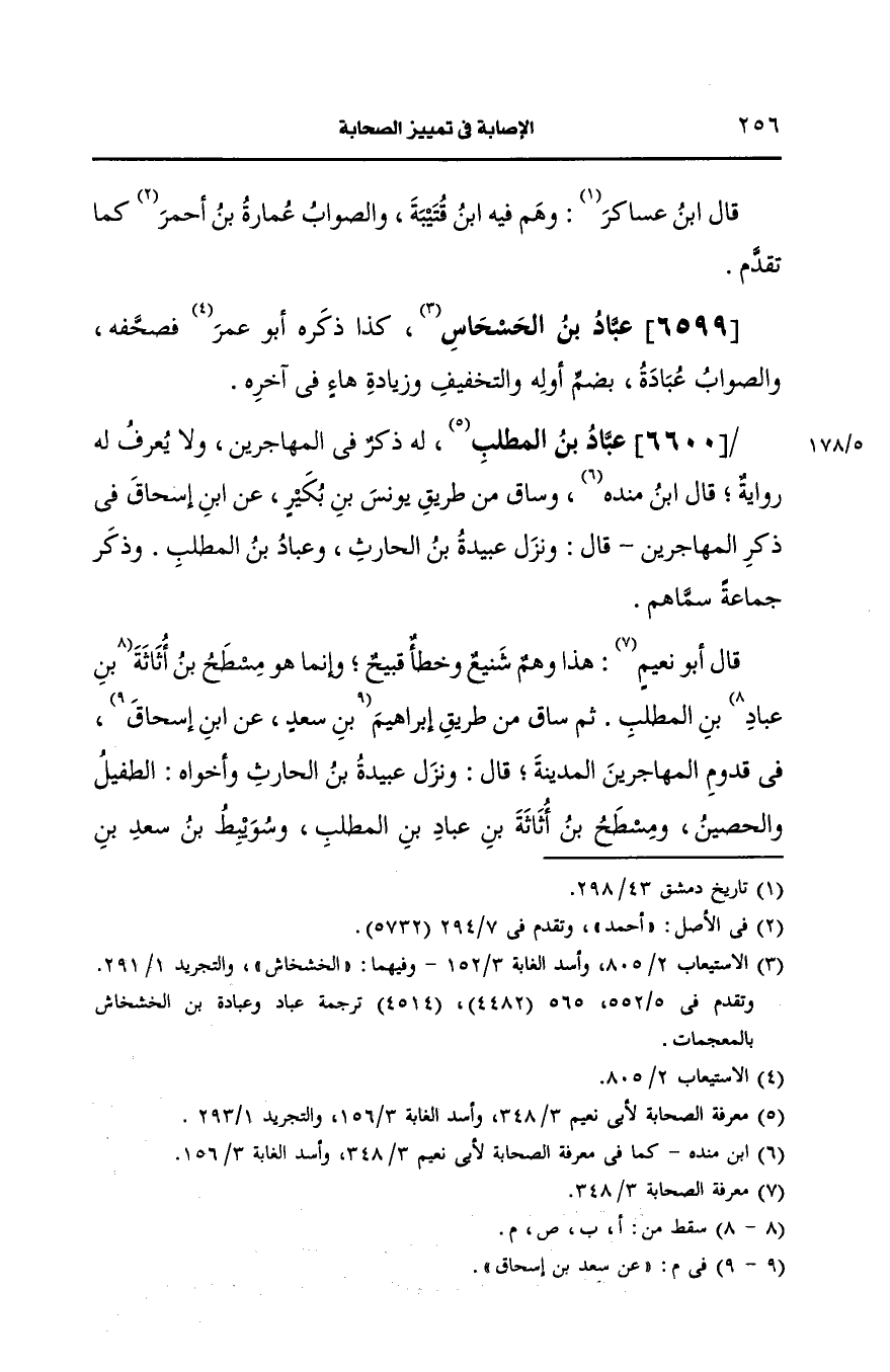 وسبب الوهم ان لفظة بن تصحفت واوا فصار الواحد اثنين مسطح بن اثاثة وعباد بن المطلب وعباد إنما هو جده مسطح وقد وقع في رواية غير ابن مَنْدَه كما وقع عنده فليس التصحيف منه لكن ما كان يليق بسعة حفظه ومعرفته ان يمشي عليه مثل هذا.