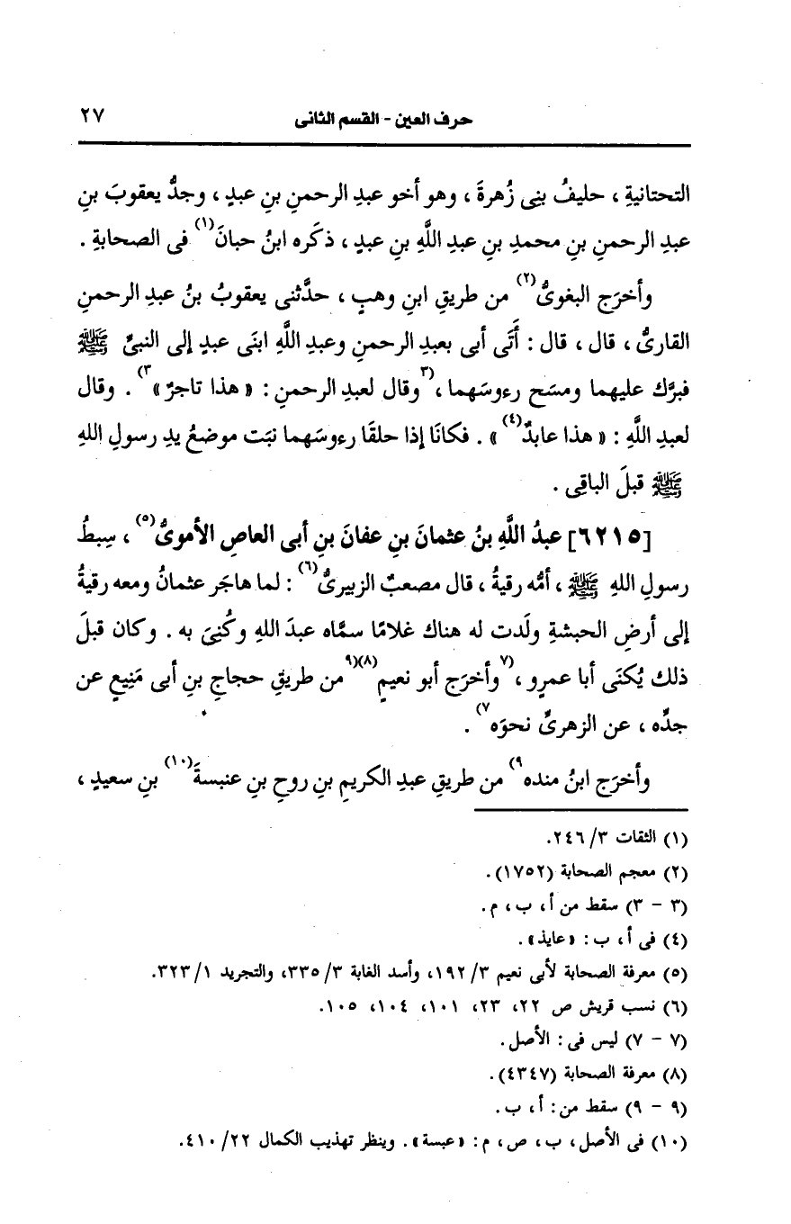 6215- (ز) عَبد الله بن عثمان بن عفان بن أبي العاص الأموي سبط رسول الله صَلى الله عَلَيه وسَلم أمه رقية.