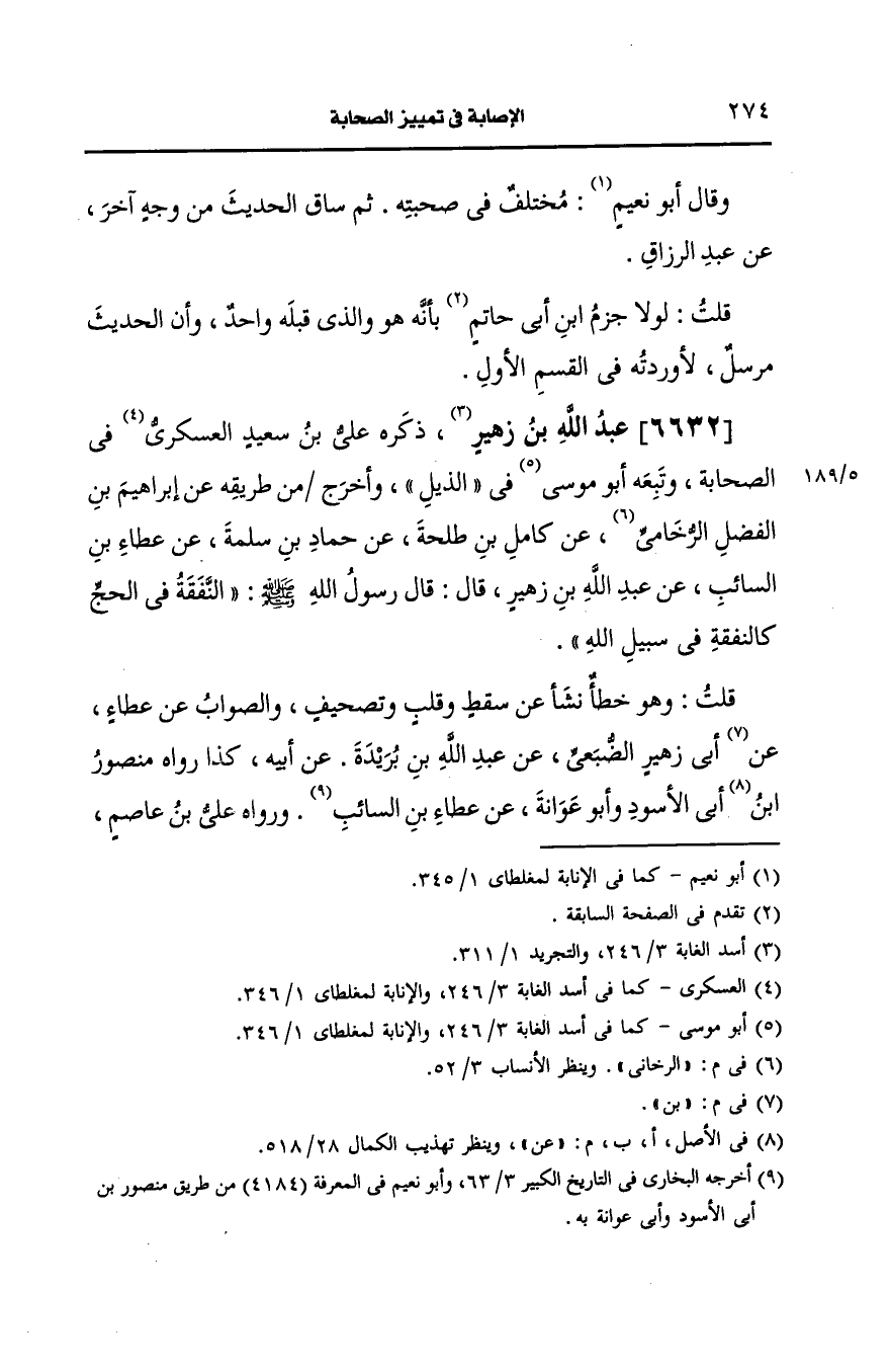 وتبعه أَبو موسى في الذيل وأخرج من طريقه، عَن إبراهيم بن الفضل الرخاني، عَن كامل بن طلحة، عَن حماد بن سلمة، عَن عطاء بن السائب، عَن عَبد الله بن زهير قال: قال رَسُولُ اللهِ صَلى الله عَلَيه وسَلم "النفقة في الحج كالنفقة في سبيل الله".