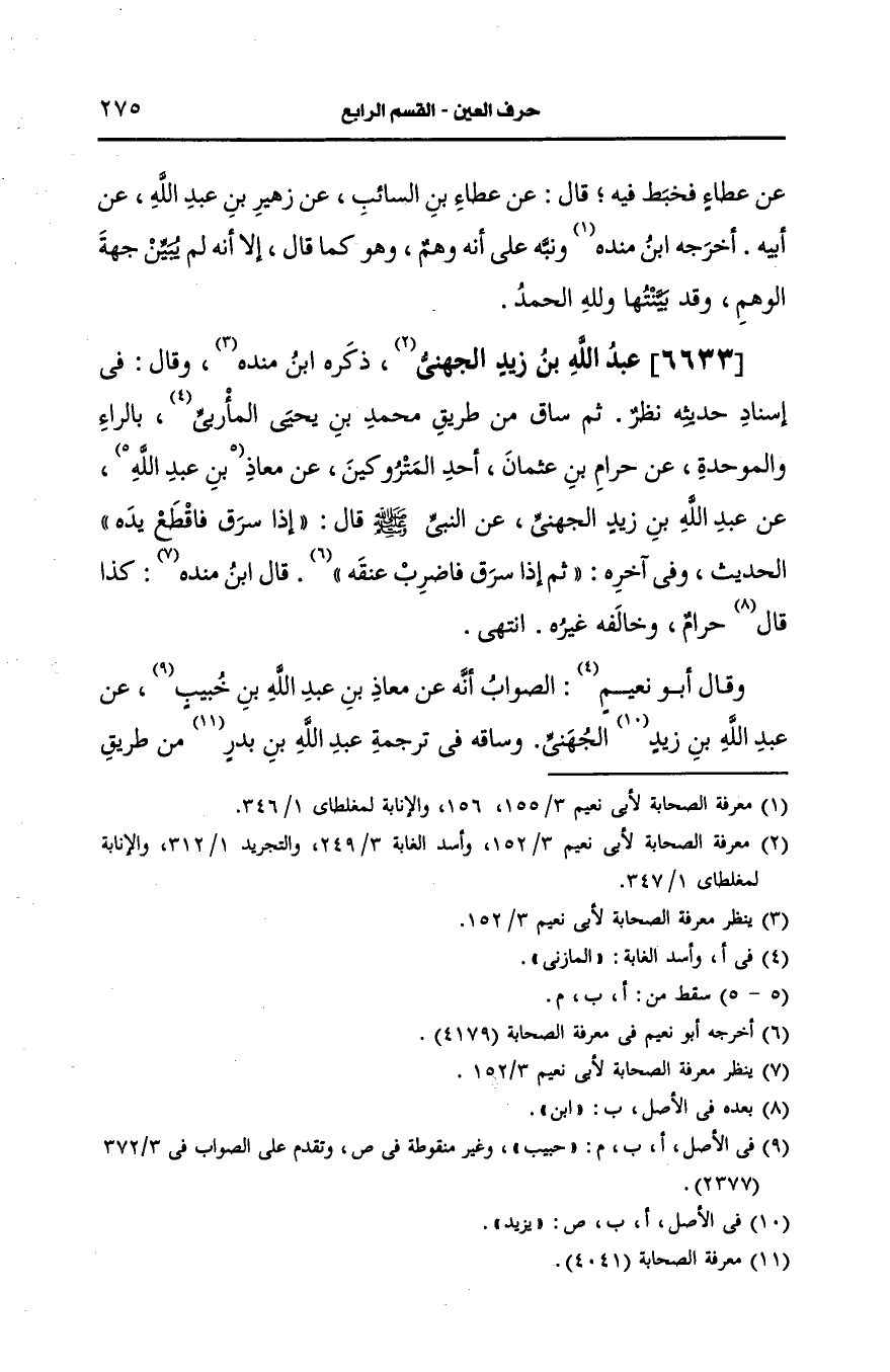 وقال أَبو نُعَيْم: الصواب أنه، عَن معاذ بن عَبد الله بن حبيب، عَن عَبد الله بن زيد الجهني وساقه في ترجمة عَبد الله بن بدر من طريق حفص بن ميسرة، عَن حرام بن عثمان، عَن معاذ كذلك فظهر منه ان الوهم من الراوي، عَن حرام بن عثمان بخلاف ما يفهمه كلام ابن مَنْدَه.