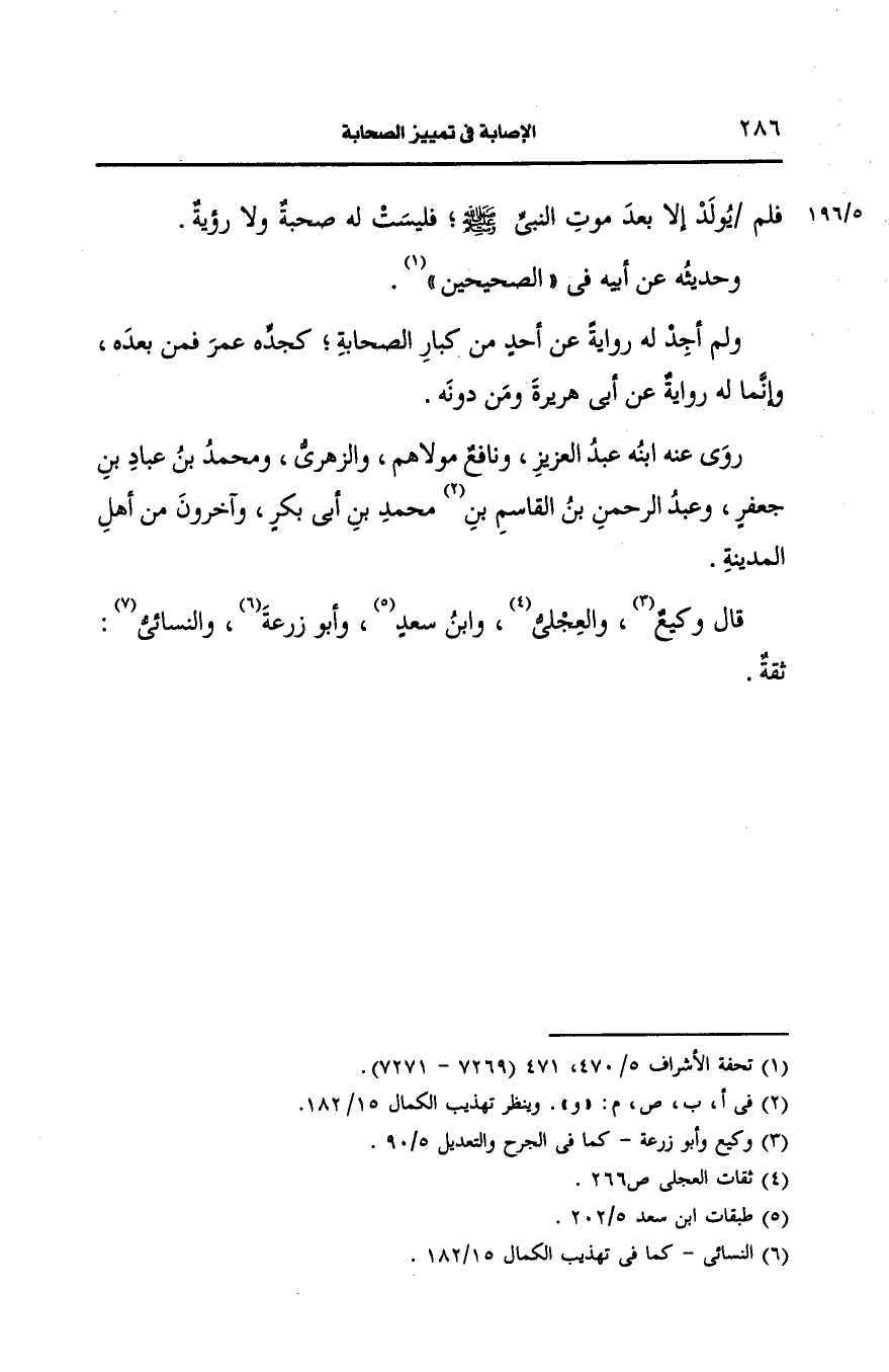وحديثه، عَن أَبيه في الصحيحين ولم أجد له رواية، عَن أحد من كبار الصحابة كجده عمر فمن بعده وانما له رواية، عَن أبي هريرة ومن دونه.