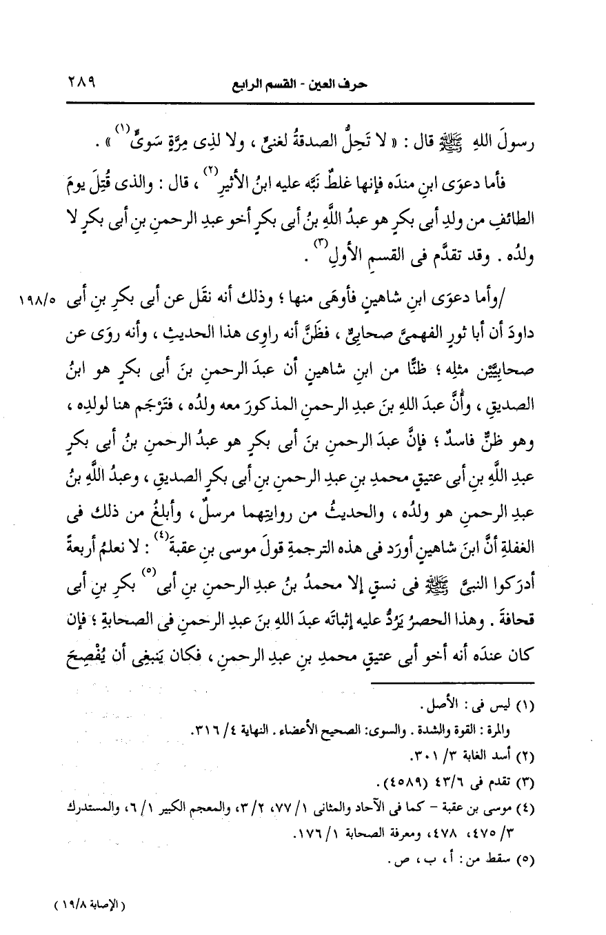 وأما دعوى ابن شاهين فأؤها منها وذلك أنه نقل، عَن أبي بكر بن أبي داود ان أبا ثور الفهمي صحابي فظن أنه راوي هذا الحديث وأنه روى، عَن صحابيين مثله ظنا من ابن شاهين ان عبد الرحمن بن أبي بكر، هو ابن الصديق وان عَبد الله بن عبد الرحمن المذكور معه ولده فترجم هنا لولده وهو ظن فاسد فان عبد الرحمن بن أبي بكر هو عبد الرحمن بن أبي بكر عَبد الله بن أبي عتيق محمد بن عبد الرحمن بن أبي بكر الصديق وعبد الله بن عبد الرحمن هو ولده والحديث من روايتهما مرسل وأبلغ من ذلك في الغفلة ان ابن شاهين اورد في هذه الترجمة قول موسى بن عقبة لا نعلم أربعة ادركوا النَّبيّ صَلى الله عَلَيه وسَلم في نسق الا محمد بن عبد الرحمن بن أبي بكر بن أبي قحافة وهذا الحصر يرد عليه إثباته عَبد الله بن عبد الرحمن في الصحابة فان كان عنده أنه أخو أبي عتيق محمد بن عبد الرحمن فكان ينبغي أن يفصح بإيراده على موسى بن عقبة وإلا فعبد الله بن عبد الرحمن هذا إنما هو حفيد محمد بن عبد الرحمن الذي ذكره موسى بن عقبة وليس صحابيا بل هو تابعي مشهور وأمه من ولد أبي بكر أخت أم المؤمنين أُم سَلَمة وحديثه، عَن أُم سَلَمة في الصحيحين.