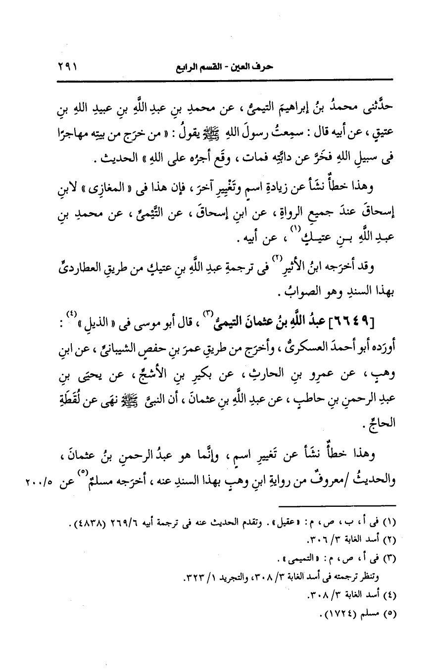 وهذا خطأ نشأ، عَن تغيير اسم وانما هو عبد الرحمن بن عثمان والحديث معروف من رواية ابن وهب بهذا السند عنه أَخرجه مسلم، عَن أبي الطاهر بن السرح، وأَبو داود، عَن أَحمد بن صالح ويزيد بن خالد والنسائي، عَن الحارث بن مسكين ثلاثتهم، عَن ابن وهب وسبق على الصواب فيمن اسمه عبد الرحمن.