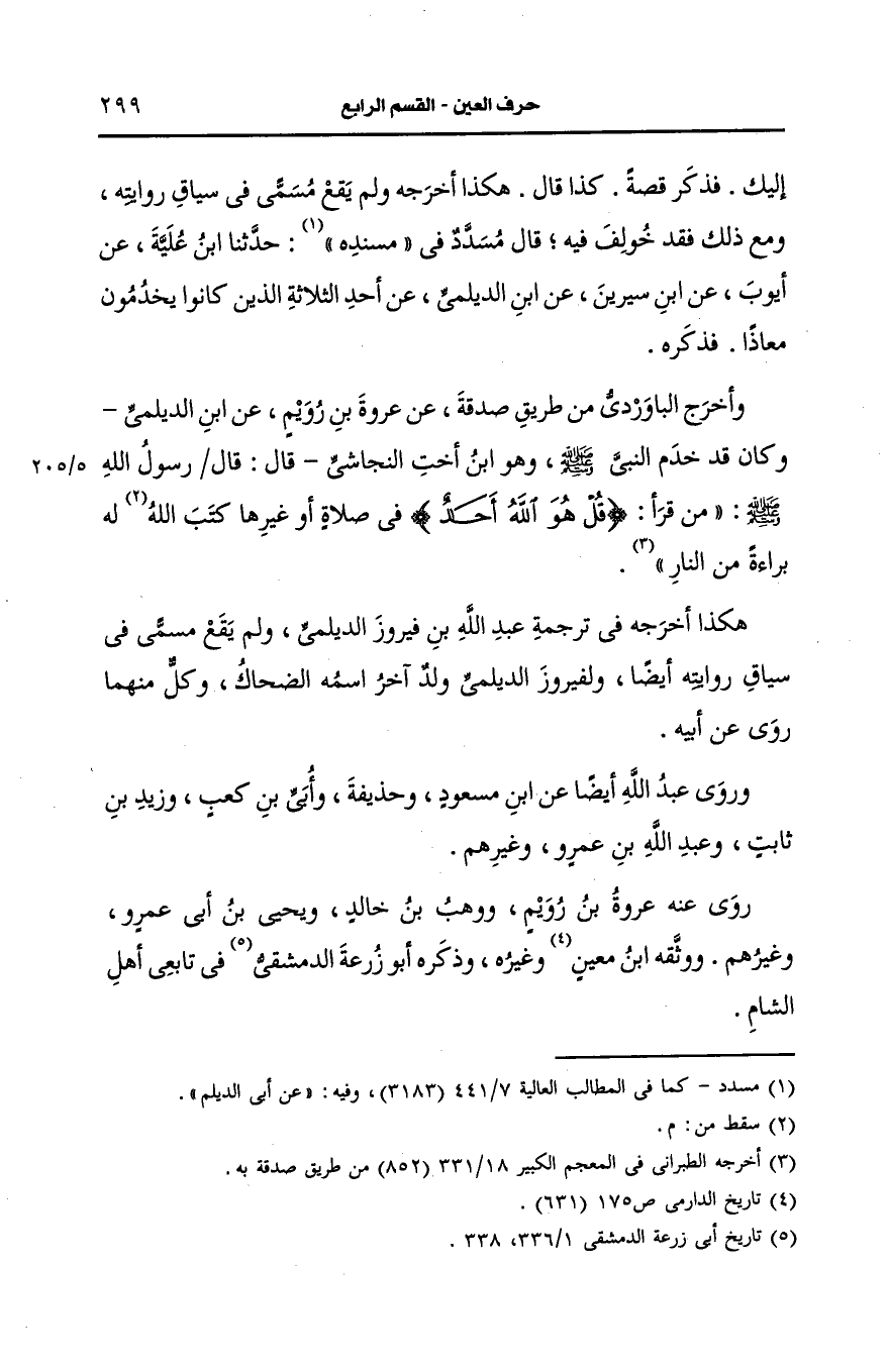 وأخرج الباوردي من طريق صدقة، عَن عُروَة بن رويم، عَن ابن الديلمي، وكان قد خدم النَّبيّ صَلى الله عَلَيه وسَلم وهو ابن أخت النجاشي قال: قال رَسُولُ اللهِ صَلى الله عَلَيه وسَلم من قرأ ?قل هو الله أحد? في صلاة أو غيرها كتب له براءة، عَن النار.