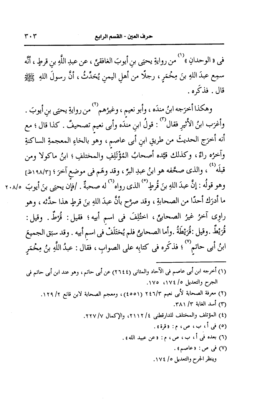 كَذا قَال مع أنه اخرج الحديث من طريق ابن أبي عاصم وهو بالخاء المعجمة الساكنة وآخره راء وكذلك قيده أصحاب المؤتلف والمختلف بن ماكولا ومن قبله والذي صحفه، هو ابن عَبد البَرِّ وقد وهم في موضع آخر وهو قوله ان عَبد الله بن قرة الذي رواه، عَن عبيد الله له صُحبَةٌ قال يحيى بن أيوب ما أدرك أحدا من الصحابة وقد صرح ان عَبد الله بن قرط هذا حدثه وهو راو آخر غير الصحابي اختلف في اسم أَبيه فقيل قرط وقيل قريط وقيل قريطة وأما الصحابي فلم يختلف في اسم أَبيه وقد سبق الجميع بن أبي حاتم فذكره في كتابه على الصواب فقال عَبد الله بن مخمر الشرعبي شامي حمصي روى عَنِ النَّبِيِّ صَلى الله عَلَيه وسَلم مُرْسَلاً.