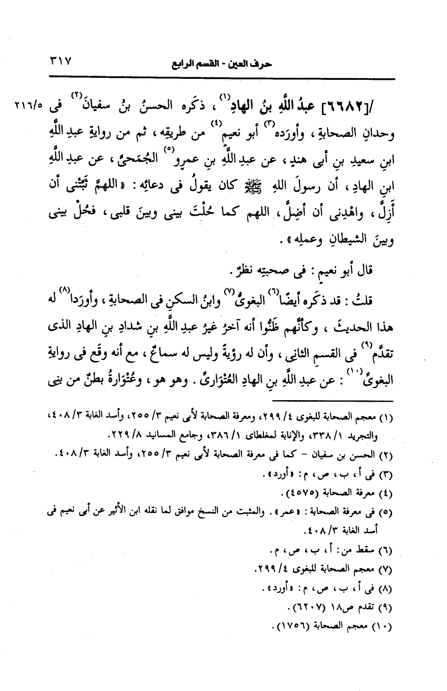 قلت: قد ذكره البغوي، وابن السَّكَن في الصحابة وأورد له هذا الحديث وكأنهم ظنوا أنه آخر غير عَبد الله بن شداد بن الهاد الذي تقدم في القسم الثاني وان له رؤية وليس له سماع مع أنه وقع في رواية البغوي، عَن عَبد الله بن الهاد العتواري وهو هو وعتوارة بطن من بني ليث وانما نسب عَبد الله في هذه الرواية لجده كما نسب أَبو شداد إلى جد أَبيه الهاد كما سبق بيأنه في ترجمته.