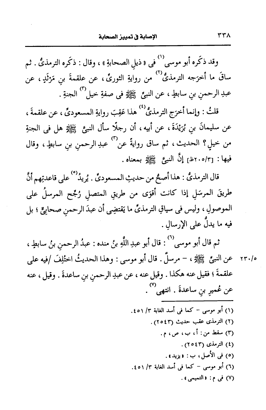 وقد ذَكَرَهُ أَبو مُوسَى في "ذيل الصحابة" وقال ذكره التِّرمِذيّ ثم ساق ما أَخرجه التِّرمِذيّ من رواية الثوري، عَن علقمة بن مرثد، عَن عبد الرحمن بن سابط عَنِ النَّبِيِّ صَلى الله عَلَيه وسَلم في صفة الجنة.