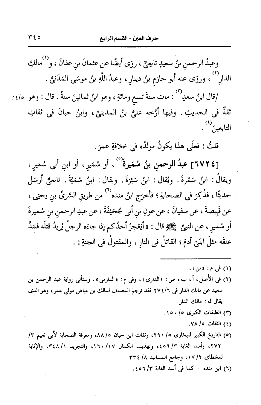 فاخرج ابن مَنْدَه من طريق السري بن يحيى، عَن قبيصة، عَن سفيان، عَن عون بن أبي جحيفة، عَن عبد الرحمن بن سميرة أو سمير عَنِ النَّبِيِّ صَلى الله عَلَيه وسَلم قال ايعجز أحدكم إذا جاءه الرجل يريد قتله فمد عنقه مثل ابني آدم القاتل في النار والمقتول في الجنة.