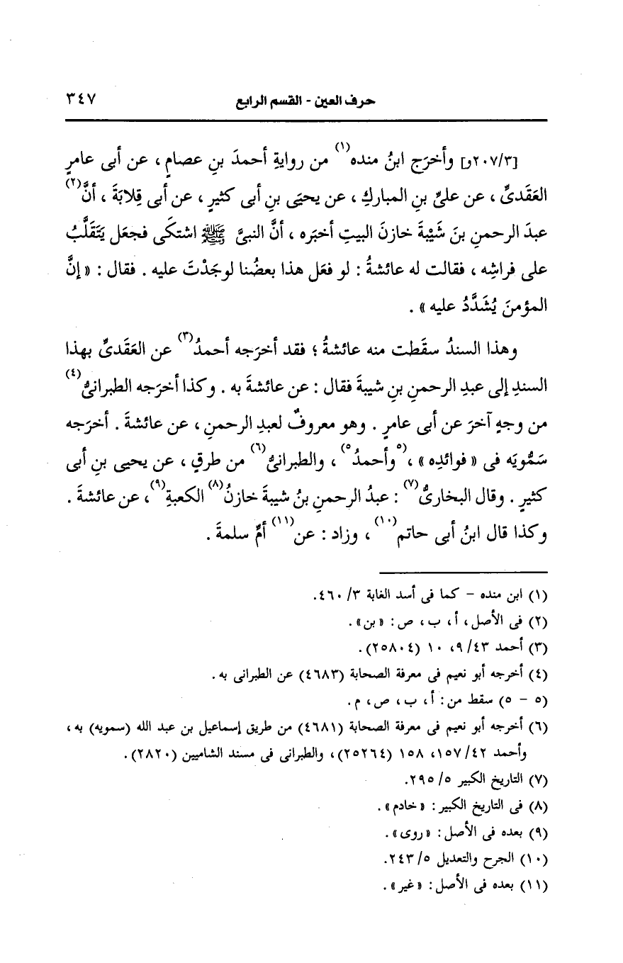 وأخرج ابن مَنْدَه من رواية أَحمد بن عصام، عَن أبي عامر العقدي، عَن علي بن المبارك، عَن يحيى بن أبي كثير، عَن أبي قلابة ان عبد الرحمن بن شيبة خازن البيت أخبره أَنَّ النَّبِيَّ صَلى الله عَلَيه وسَلم اشتكى فجعل يتقلب على فراشه فقالت له عائشة لو فعل هذا بعضنا لوجدت عليه فقال "إن المؤمن يشدد عليه".