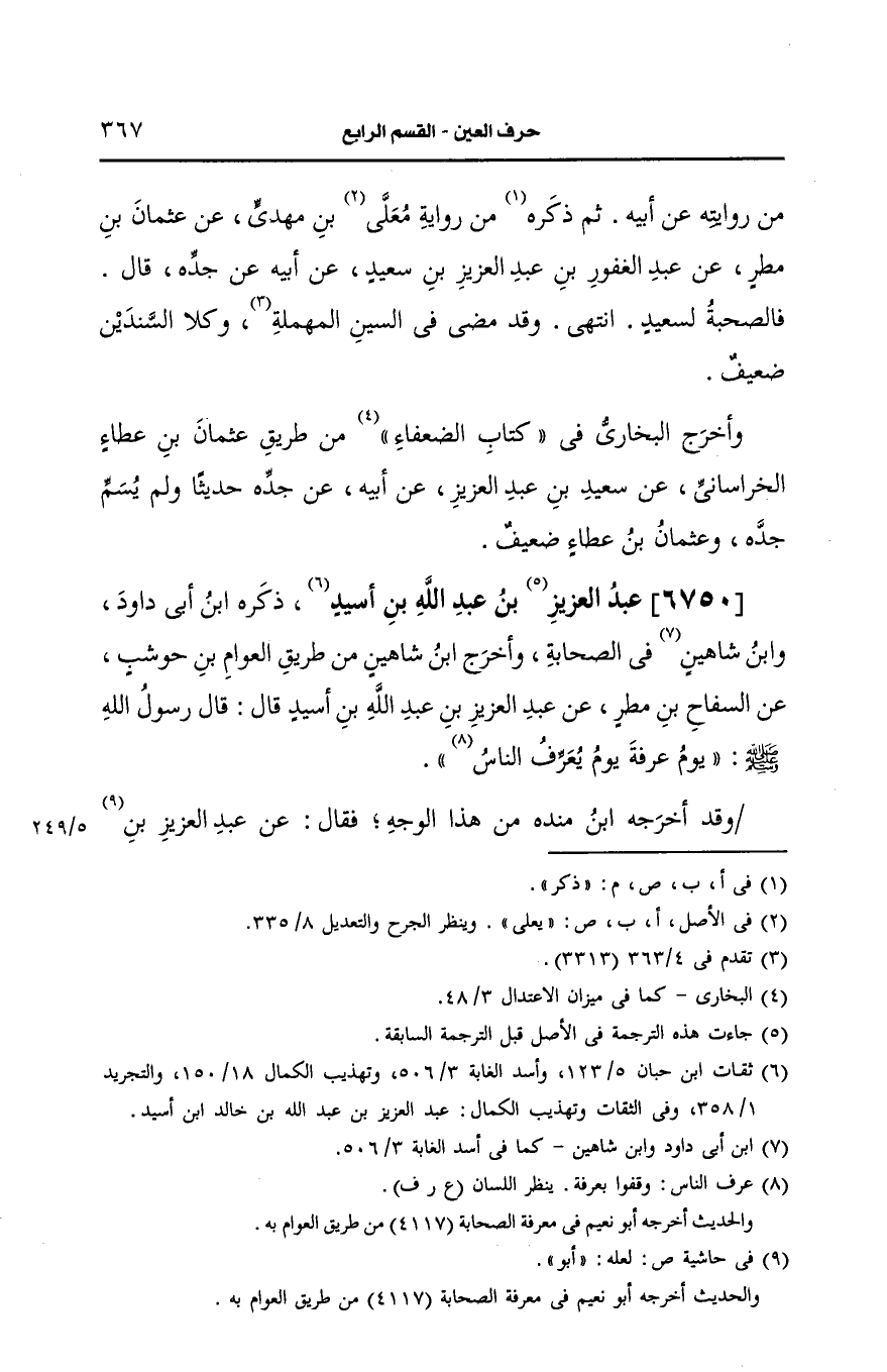 وأخرج ابن شاهين من طريق العوام بن حوشب، عَن السفاح بن مطر، عَن عبد العزيز بن عَبد الله بن اسيد قال: قال رَسُولُ اللهِ صَلى الله عَلَيه وسَلم "يوم عرفة يوم يعرف الناس".