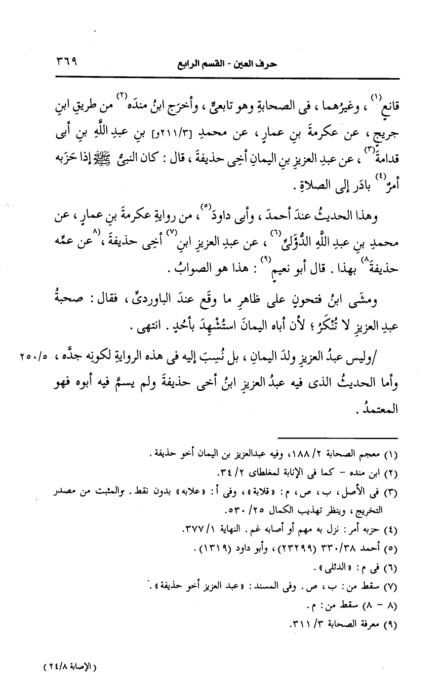 قال أَبو نعيم هذا هو الصواب ومشى ابن فتحون على ظاهر ما وقع عند الباوردي فقال صحبة عبد العزيز لا تنكر لان أباه اليمان استشهد بأحد انتهى.