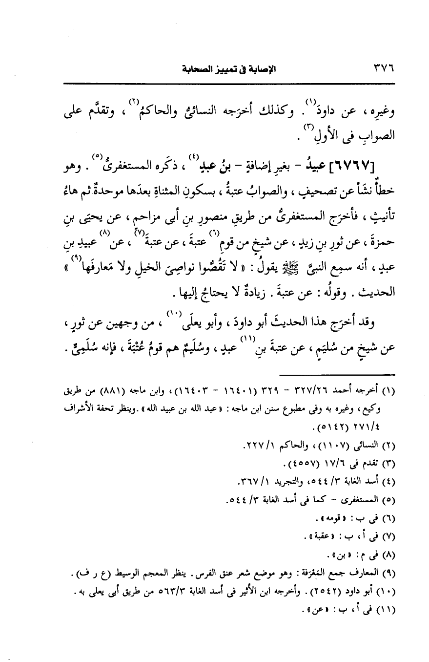 ذكره المستغفري وهو خطأ نشأ، عَن تصحيف والصواب عتبة بسكون المثناة بعدها موحدة ثم هاء تأنيث فأخرج المستغفري من طريق منصور بن أبي مزاحم، عَن يحيى بن حمزة، عَن ثور بن زيد، عَن شيخ من قوم عتبة، عَن عتبة بن عبيد بن عبد أنه سمع النَّبيّ صَلى الله عَلَيه وسَلم يقول لا تقصوا نواصي الخيل ولا معارفها ...الحديث.